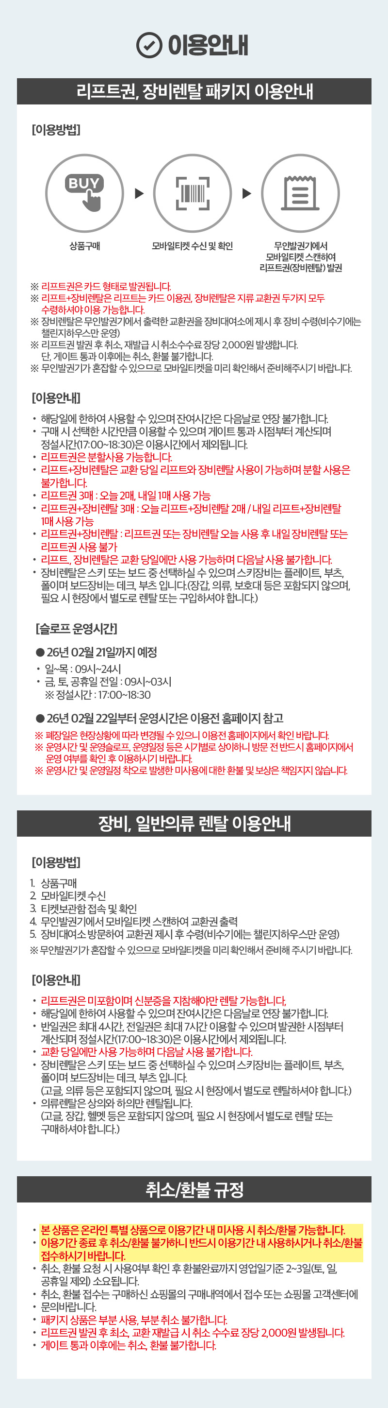 ※ 운영시간 및 운영슬로프, 운영일정 등은 시기별로 상이하니 방문 전 반드시 홈페이지 운영 여부를 확인 후 이용하시기 바랍니다.