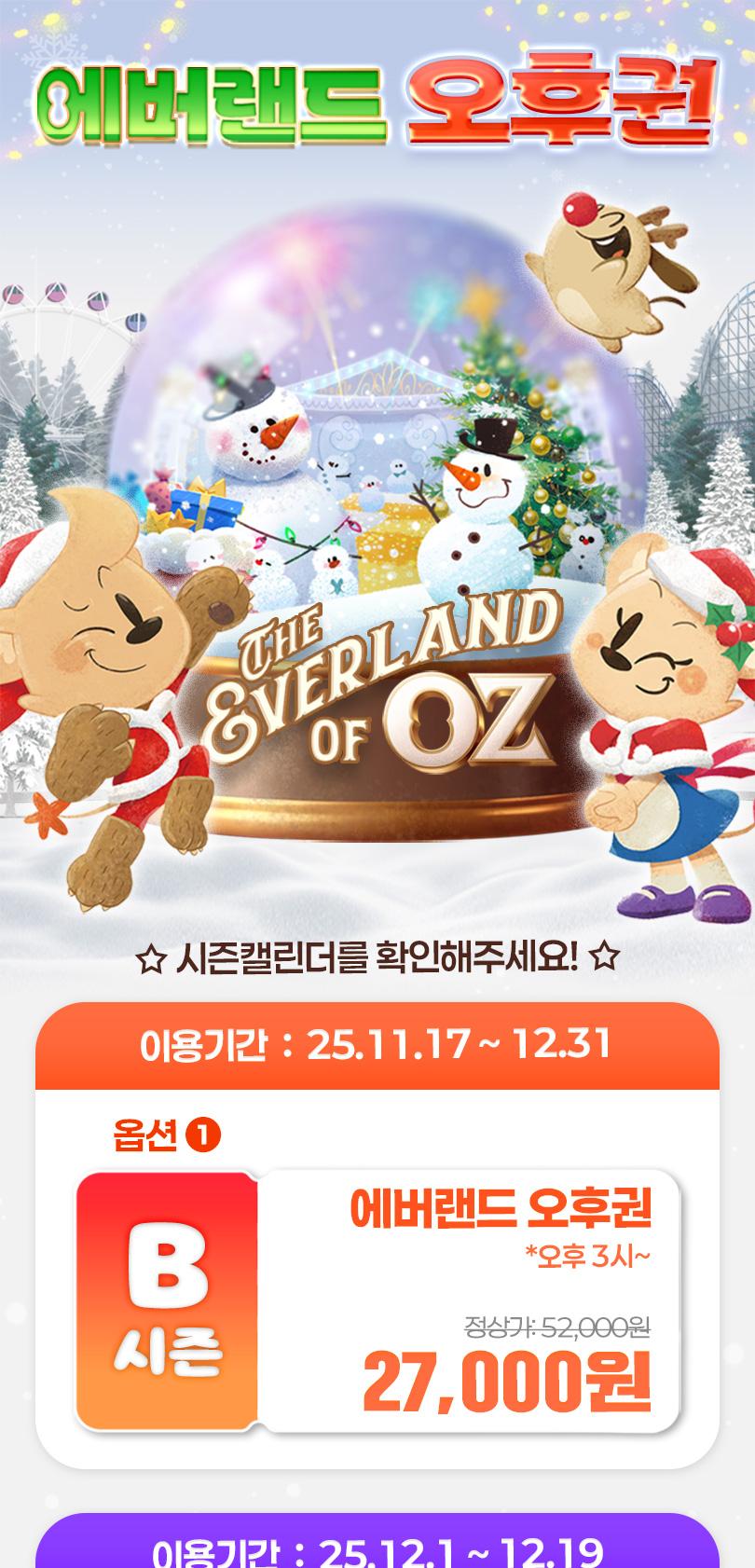 서울 근교에 다녀올 곳은 언제나 환상의 나라 에버랜드죠! 해당 티켓은 오후 3시부터 입장 가능한 오후 이용권으로 보다 합리적인 가격에 에버랜드를 알차게 즐길 수 있어 더욱 좋아요.