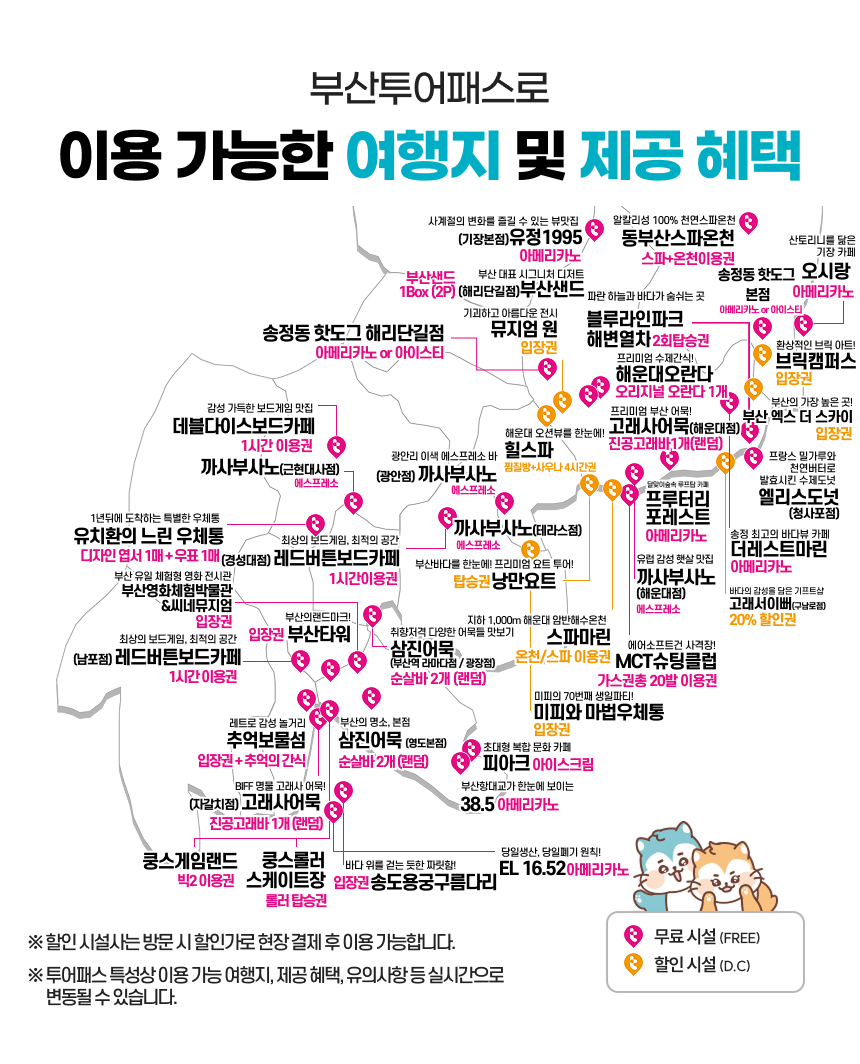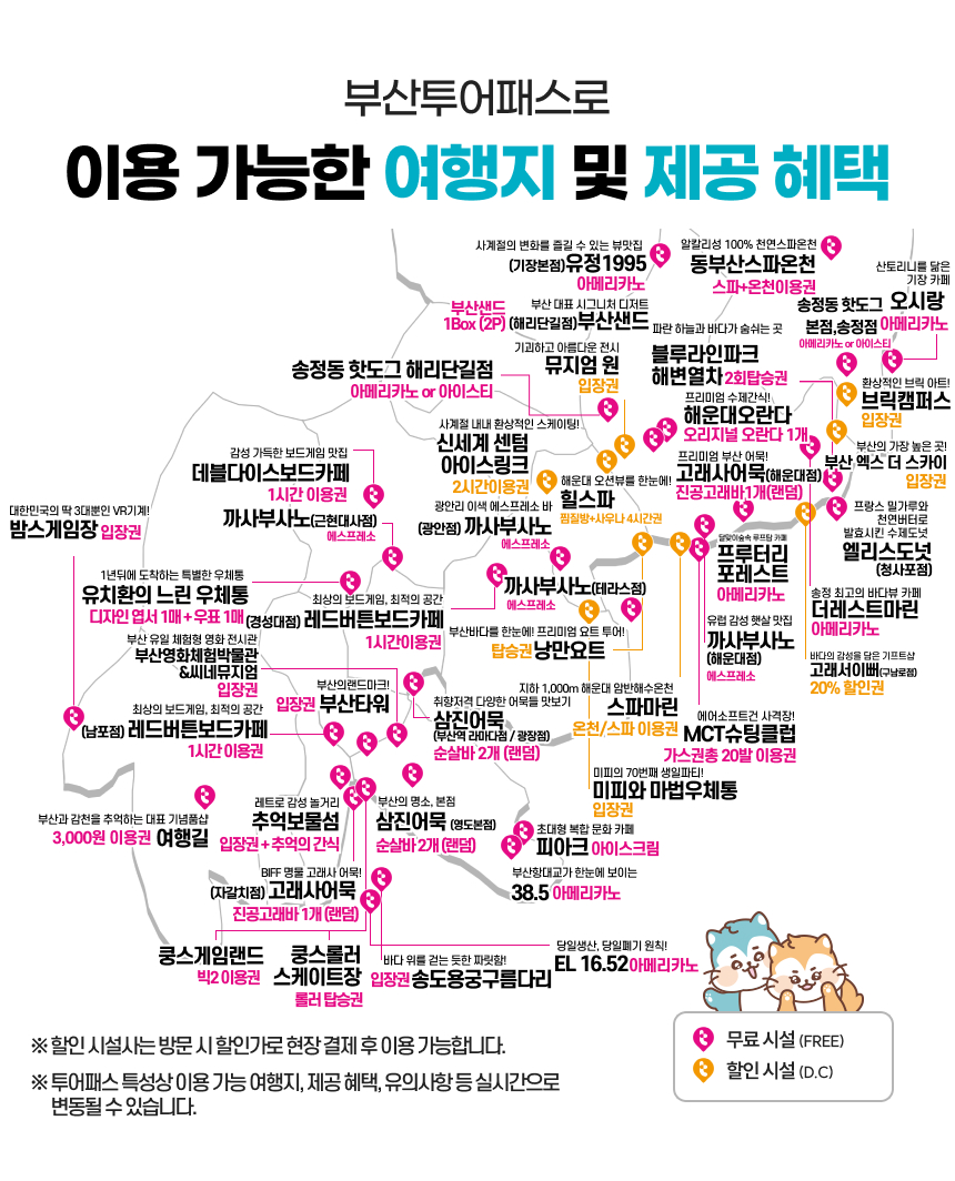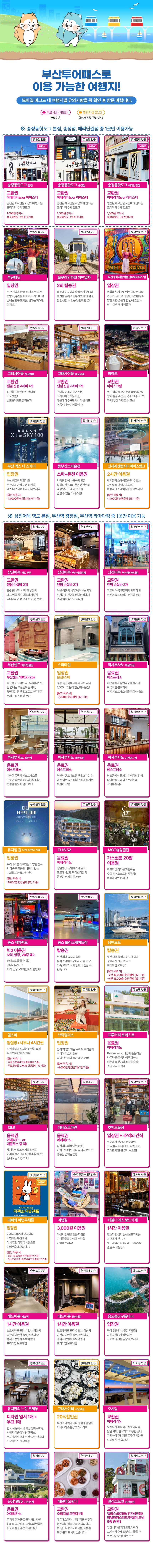 베스트차량으로 이동할 때, 더욱 잘 즐기실 수 있을 것 같아요:) ★패스권 참고 사항 - 1시간의 텀을 두고 사용 가능 / 구매 후 오는 링크를 통해 근처 매장, 남은 시간 등 확인 가능 ★사용자 정보 - 2인 / 차량 이용 / 1일차 오후 5시부터 사용 ★ 대략 얼마나 절약했나? 10만원!!!!!! - 추가금+패스구매 비용 = 55,300원 - 실 정가 기준 = 150,300원 "내돈내산인데 넘 맘에 들어 상세하게 리뷰 남기니 참고해 주세용~~~" ★1일차 오후 (흰여울길 - 부산타워 - 포장마차 - 아쿠아펠리스) (1) 흰여울길 인생네컷 (정가 - 5,000원) - 흰여울길에서 제공하는 인생네컷 이용권은 시간 카운팅에 포함되지 않아요! (2) 하이까눌레 (정가 - 2,500원) - 흰여울길에서 인생네컷 찍고 위쪽으로 걸어올라가서 내려가면서 마주할 수 있는 하이까눌래!! 인생네컷 카운팅이 안되어서 이때 카운팅 시작했습니다 ㅎㅎ (3) 부산타워 (정가 - 12,000원) - 부산타워.. 사실 돈 내고 갔으면 약~간 실망했을 수도 ㅎㅎ 다이아몬드 퀴즈 맞춰서 선물받는게 있는데.. 중간에 다 놓쳐서 인터넷 검색해서 정답찾았어요 (힌트 : 부산타워 완공일) (4) 쿵스게임랜드 (정가 - 3,500~5,000원) - 손님도 직원도 별로 없는.. 조용한 게임장.. ㅋㅋ 겨우 전화번호 찾아서 호출해서 이용했어요. VR은 멀미날거같아서 사격만 두번했는데 시간 때우러 가기 좋아요, 주차는 직원분께 말씀드려서 등록했습니다. (5) 아쿠아펠리스 (정가 - 2~4만원 : 네이버 예약가는 더 저렴함) 추가금 8천원 - 주차가 최대 8시간 지원이라고 해서 12시 좀 넘어서 들어갔더니 넘 조용하고..ㅋㅋ 꽤 넓고 쾌적합니다. (그 전에는 워터파크 포함이었는데, 9월되면서 지금은 제외된 듯하네요.) 진짜 숙박비 굳었어요!!! ★2일차 오전 (광안리 - 해변열차 - 다릿돌전망대 - 청사포) (1) 까사부사노 광안점 (할인 - 2,000원) - 아쿠아펠리스와 가깝습니다! 전 아포가토 먹었는데.. 넘 취저였어요 최고!! (2) 해변열차 ( 정가 - 12,000원) - 청사포 다음역인 다릿돌전망대에서 내려서 전망대 구경하고 청사포 방향으로 걸어갔어요. 열차 지나가는 찰나에 인생영상과 사진은.. 못 찍었습니다. 생각보다 건지기 어렵더라고요? (3) 앨리스도넛 청사포점 (정가 - 3,500원 ~ 4,300원) - 해변열차 청사포 역 도보 3분거리에 앨리스도넛이 있답니다:) 놓치지 마시고 꼭 챙기세요!!