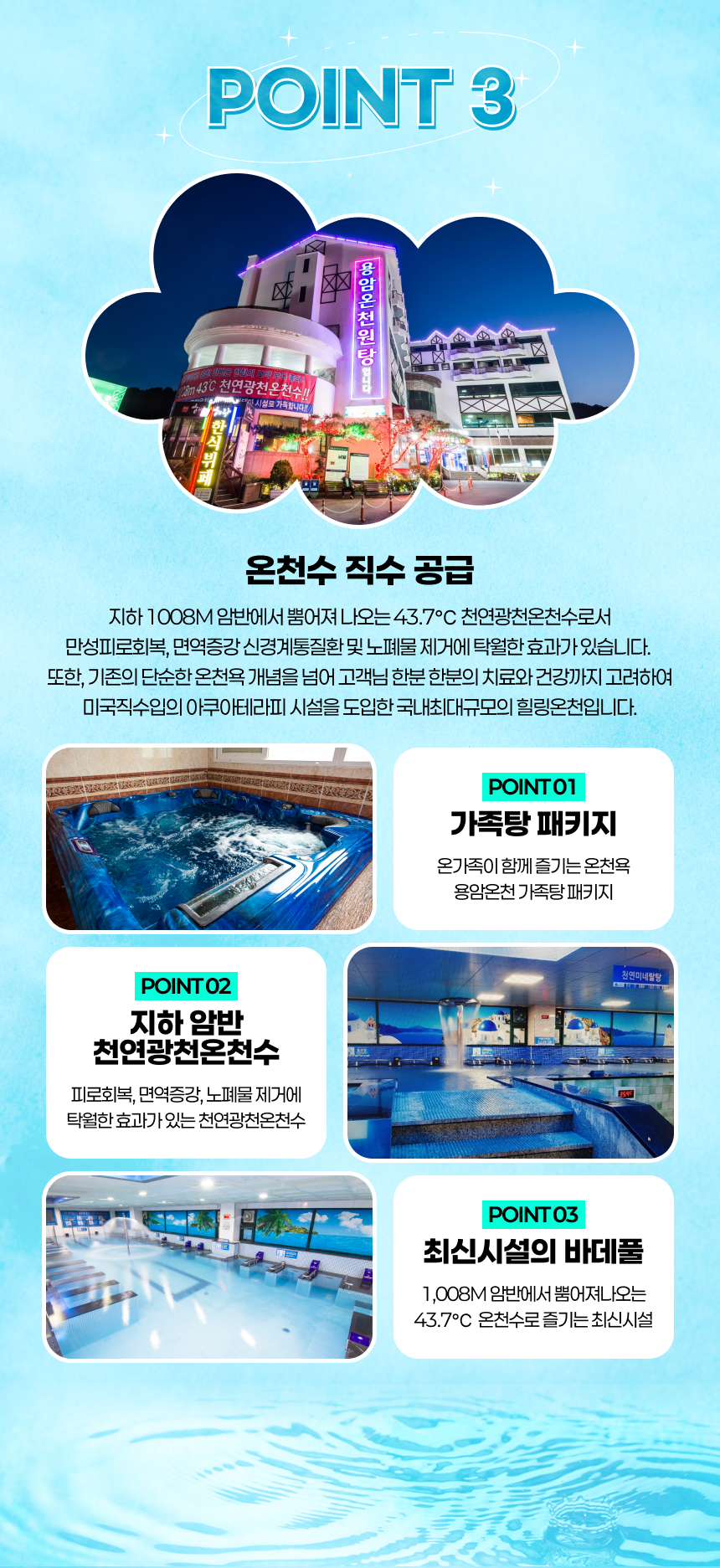 복잡한 일상에서 벗어나 조용하게 힐링하고 싶을 때 추천해요. 가족이나 연인과 함께 프라이빗한 공간에서 여유로운 온천 시간을 보내기 좋아요. ♨️지하 1,008m 암반에서 솟아나는 43.7℃ 천연광천온천수를 사용하는 가족탕이에요. 만성 피로 회복과 면역 증강, 신경계 이완에 도움을 주는 온천욕을 편안하게 즐길 수 있어요. 👨👩👧👦대중탕 이용이 부담스럽거나 오롯이 일행끼리 시간을 보내고 싶은 분들께 잘 어울려요. 휴식과 건강을 함께 챙길 수 있는 프라이빗 가족탕 이용권이에요. ✨
