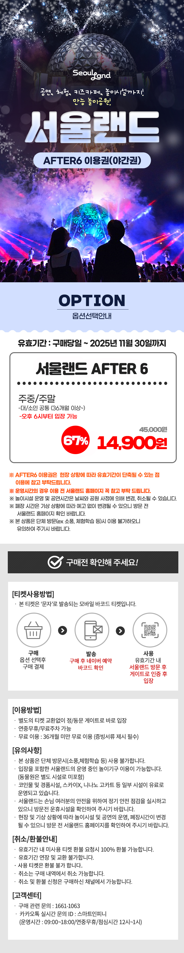 낮과는 또 다른 매력! 서울랜드의 밤을 즐겨보세요. 해당 티켓은 6시 이후에 입장 가능한 티켓으로 반짝이는 빛과 음악으로 물든 서울랜드의 '루나파크'를 즐길 수 있어요. 강렬한 불꽃과 함께하는 환상적인 뮤지컬 공연인 루나-빛의 전설, 심장을 뛰게 하는 루나밴드, 밤하늘의 오로라를 연상시키는 풀 컬러 레이저쇼와 다채로운 포토존까지! 서울랜드에서의 낭만 있는 밤, 합리적인 가격에 방문해 보세요.