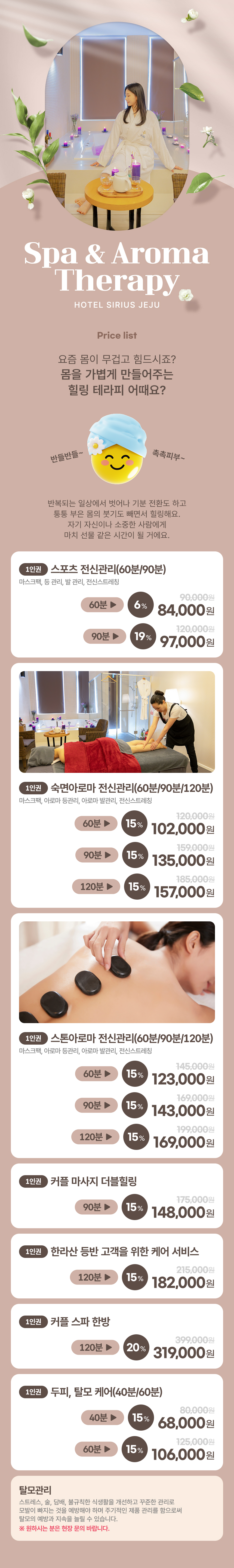 여행에 지친 몸을 제주 호텔 시리우스 스파에서 시원하게 풀어보세요. 제주 호텔 시리우스 10층에 위치한 스파 엔 아로마테라피로 편안하고 품격있는 공간에서 최고의 서비스를 경험할 수 있어요. 제주공항에서 차량으로 7분 거리에 있어 이동이 편해요. 다양한 아로마 오일과 전문 테라피스트의 손길로 여행의 피로를 싹 날려보세요.