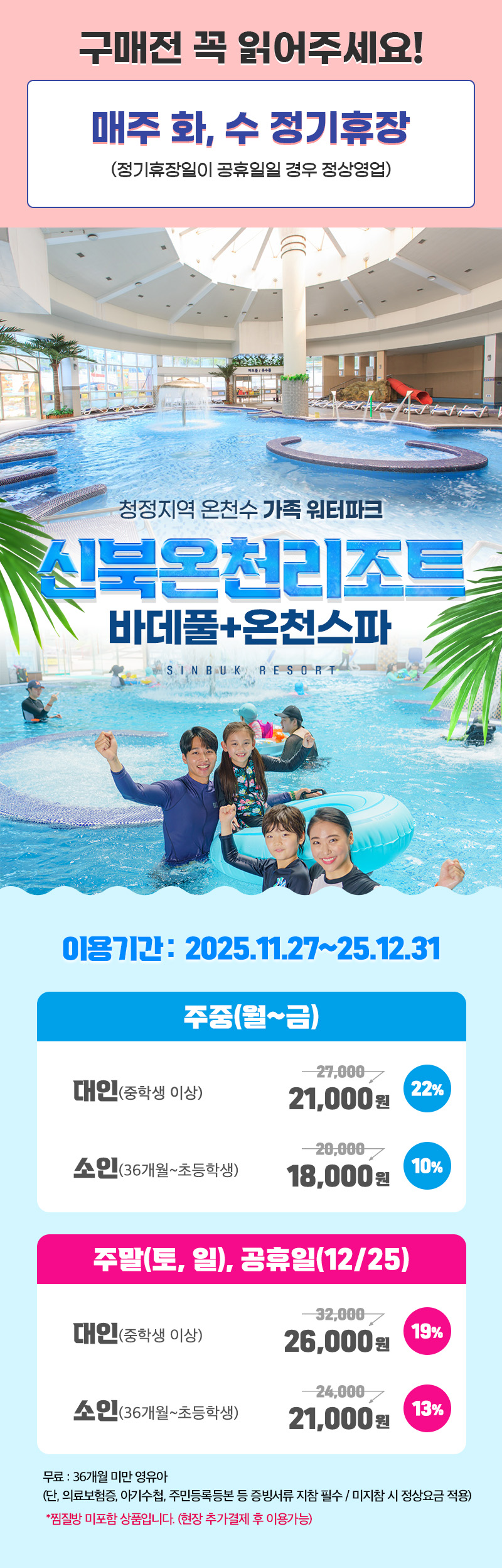 서울에서 약 1시간 거리, 사계절 이용 가능한 신북온천 리조트 워터파크를 소개해요. 신북리조트는 공기 좋고 물 좋은 포천의 휴양림 속에 위치해 있어요. 신북온천에서는 지하 600n에서 용출되는 중탄산나트륨 온천수를 사용하고 있어 피부에 좋을 뿐만 아니라 건강 회복과 증진, 피로와 스트레스 해소에 탁월한 효능이 있어요. 실내 바데풀, 아이들도 즐길 수 있는 유수풀까지 남녀노소 함께 이용할 수 있는 신북온천 리조트 워터파크를 방문해 보세요!