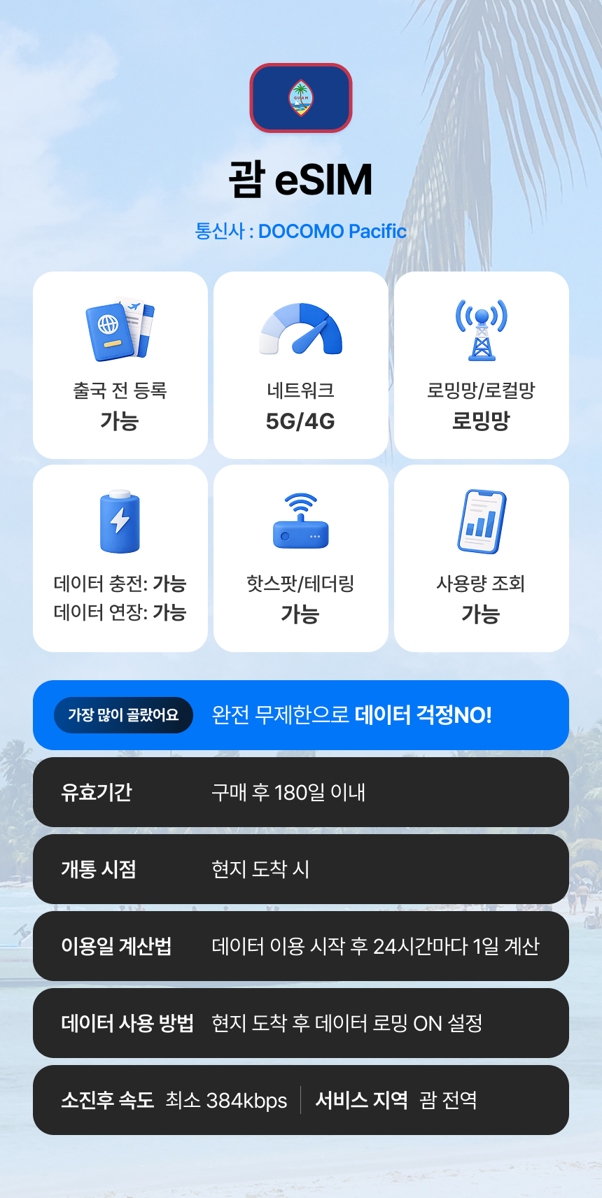 여행 중 필수로 필요한 데이터! 여행을 편안하게 시작하고 싶다면 데이터 eSIM을 추천해요. 별도의 SIM 교체 없이 스마트폰 설정만으로 이용이 가능한 상품이에요. 무거운 공유기는 더 이상 들고 다니지 마세요! 더욱더 가볍고 편리하게, 그리고 저렴하게 여행을 시작해 보세요.