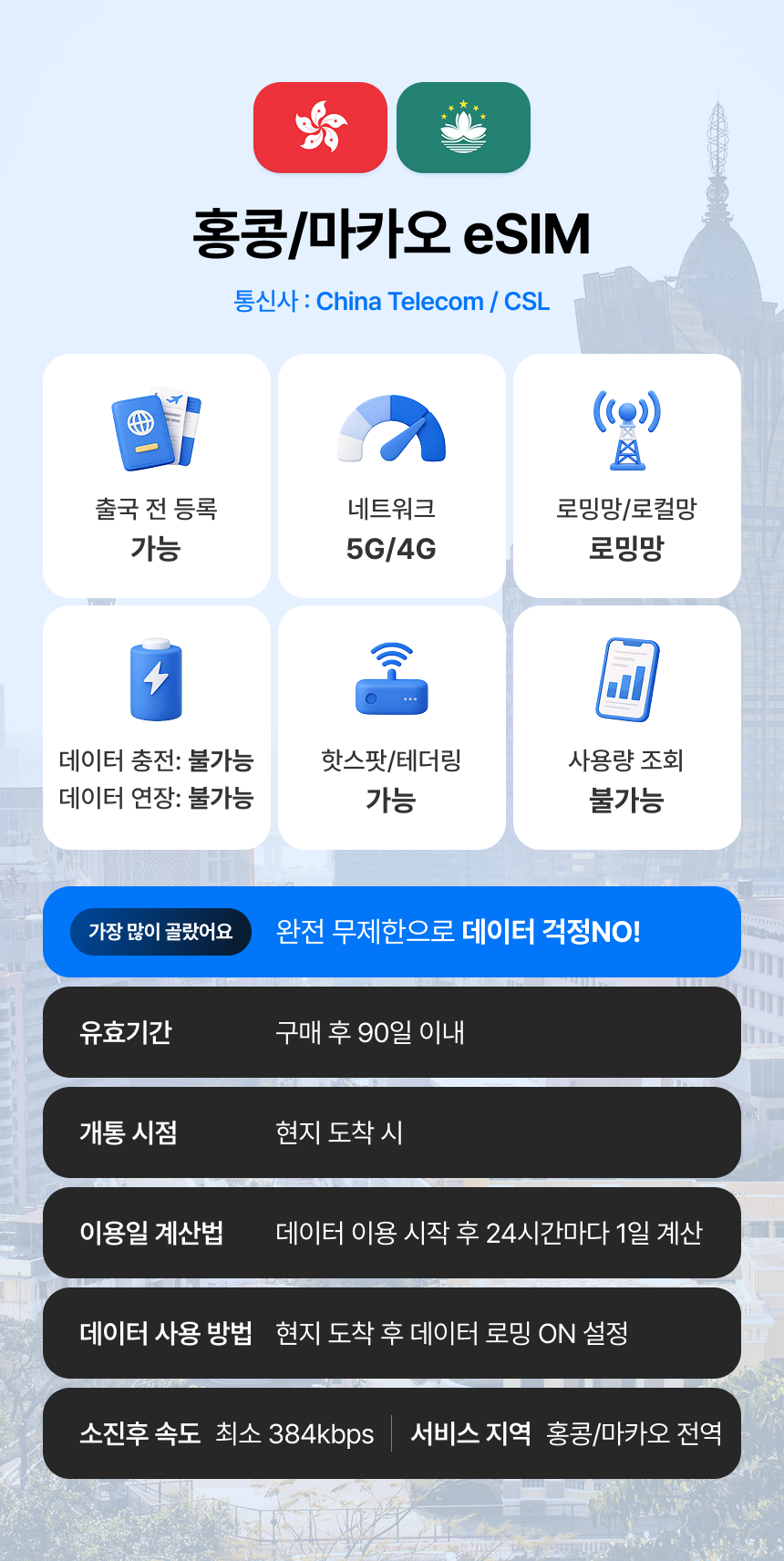 베스트eSIM은 출발전 한국에서 미리 등록하고 현지도착해서 새로 등록한 eSIM 켜서 사용하세요. 와그 직원한테 미리 등록해도 되냐 물었는데 역시 모르네요ㅠㅠ QR로 등록이 안되면 SM-DP+주소랑 활성화코드 입력해서 진행하면되요. eSIM은 처음이라 불안해서 이것저것 검색하다 한국에서 미리 등록하라는 블로거 글보고 인천공항에서 등록했는데 마음은 급하고 큐알은 안되고 당황하다 카톡으로 유심사 상담원이 친절히 안내해주셔서 무사히 등록하고 잘 사용하고 왔습니다. 홍콩은 여행자인증(?)도 받아야하는데 그것도 한국에서 할수있어요. 여권사진 찍어서 등록해야해요. 와이파이 잘되는 곳에서 맘 편히 미리 등록해놓고 가시는게 좋아요.