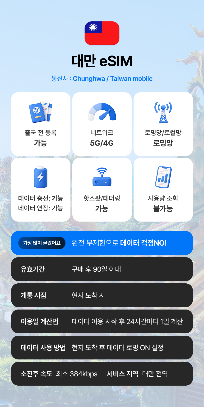 편리한 해외여행을 위해선 무제한 데이터가 필수죠! 대만에서 여유롭게 데이터를 사용해 인터넷을 이용하고 싶다면 데이터 무제한 eSIM을 추천해요. SIM 카드를 분리 및 따로 보관할 필요가 없는 eSIM은 파손, 분실 걱정이 없어 더욱 간편하게 여행을 떠날 수 있어요. 포켓 와이파이나 USIM을 따로 수령할 필요 없이 QR 코드만 수령하여 eSIM을 휴대폰에 등록하면 바로 사용이 가능해요.