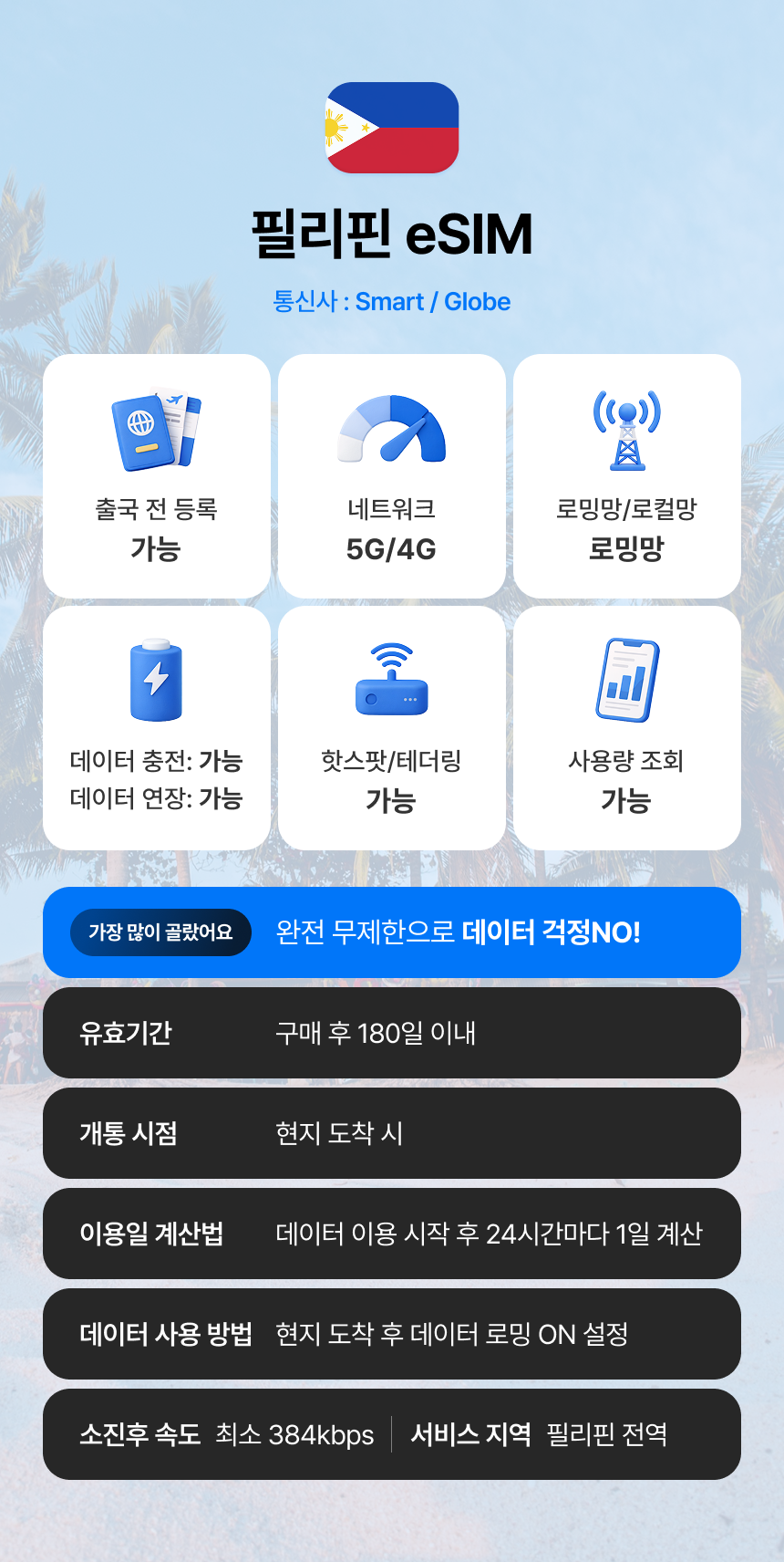 여행 중 필수로 필요한 데이터! 여행을 편안하게 시작하고 싶다면 데이터 eSIM을 추천해요. 별도의 SIM 교체 없이 스마트폰 설정만으로 이용이 가능한 상품이에요. 무거운 공유기는 더 이상 들고 다니지 마세요! 더욱더 가볍고 편리하게, 그리고 저렴하게 여행을 시작해 보세요.