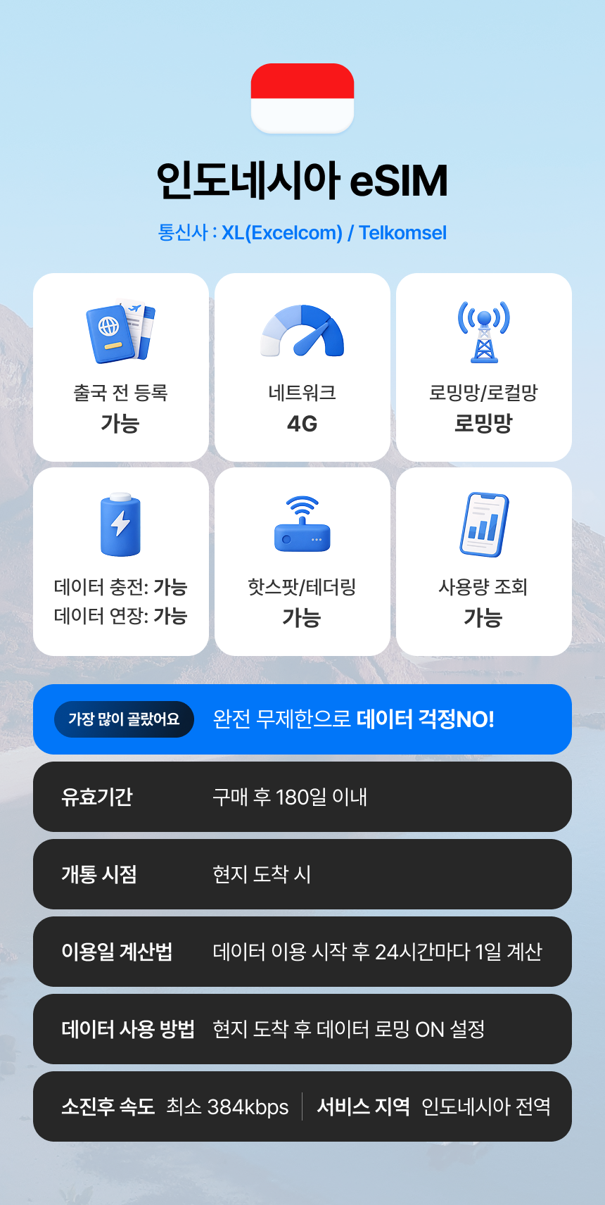 여행 중 필수로 필요한 데이터! 여행을 편안하게 시작하고 싶다면 데이터 eSIM을 추천해요. 별도의 SIM 교체 없이 스마트폰 설정만으로 이용이 가능한 상품이에요. 무거운 공유기는 더 이상 들고다니지 마세요! 더욱더 가볍고 편리하게, 그리고 저렴하게 여행을 시작해보세요.