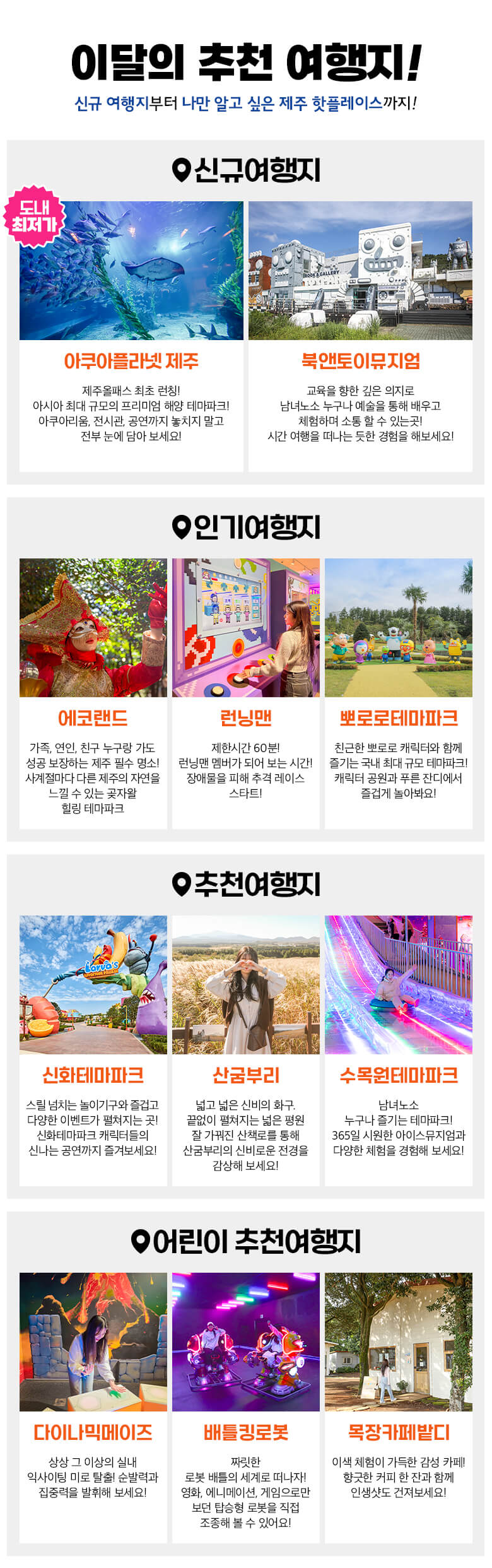 에메랄드빛 해변과 천혜의 자연경관을 자랑하는 제주도! 티켓 하나로 쉽고 간편한 제주 여행을 떠나볼까요? 수려한 테마파크부터 스릴감 있는 어트랙션과 색다른 워터쇼까지 즐길 수 있어요. 특히, 올패스만의 여름 시즌 이벤트! 시원하고 짜릿하게 즐기는 주상절리 제주제트로 무더위를 날려보세요.