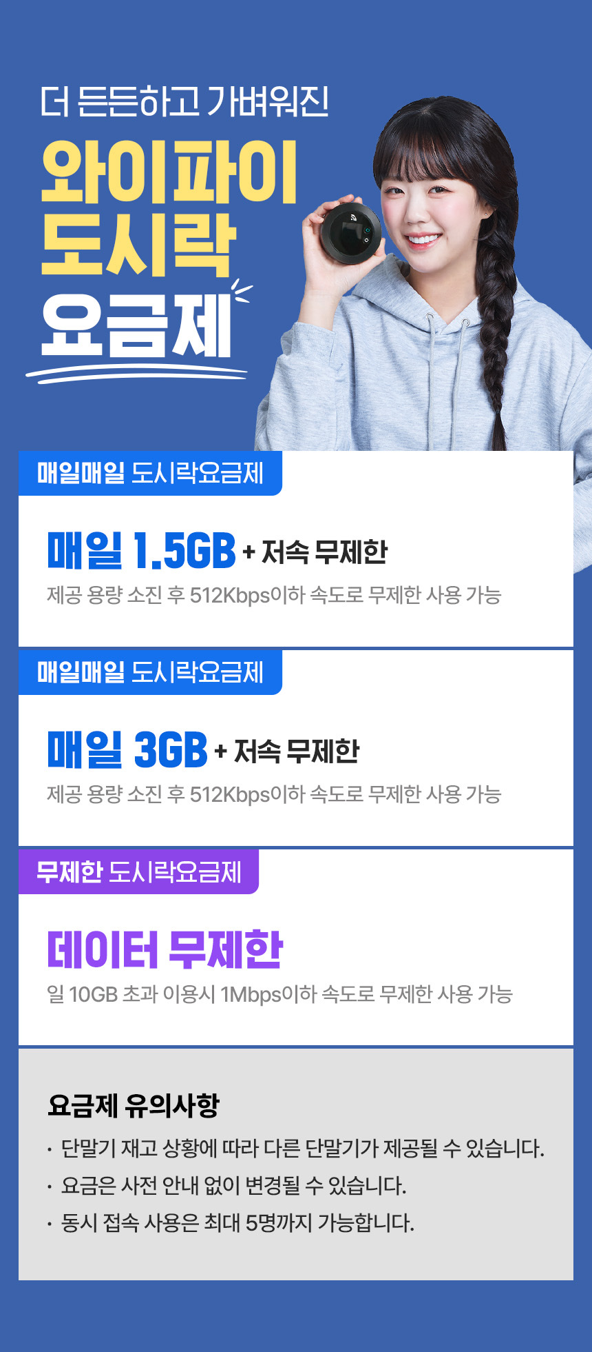 즐거운 여행이 더욱 편리하도록 도와줄 와이파이 도시락의 포켓 와이파이를 소개해요. 와이파이 도시락은 안 써본 사람은 있어도 한 번만 써본 사람은 없는 국내 최대, 최고의 로밍 전문 기업이에요. 인천공항 제1터미널 3층, 인천공항 제2터미널, 김해공항, 김포공항, 대구 공항, 청주 공항, 서대문까지! 전국 주요 공항 로밍센터를 운영하고 있어 원하는 곳 어디서든 간편하게 수령할 수 있어요.