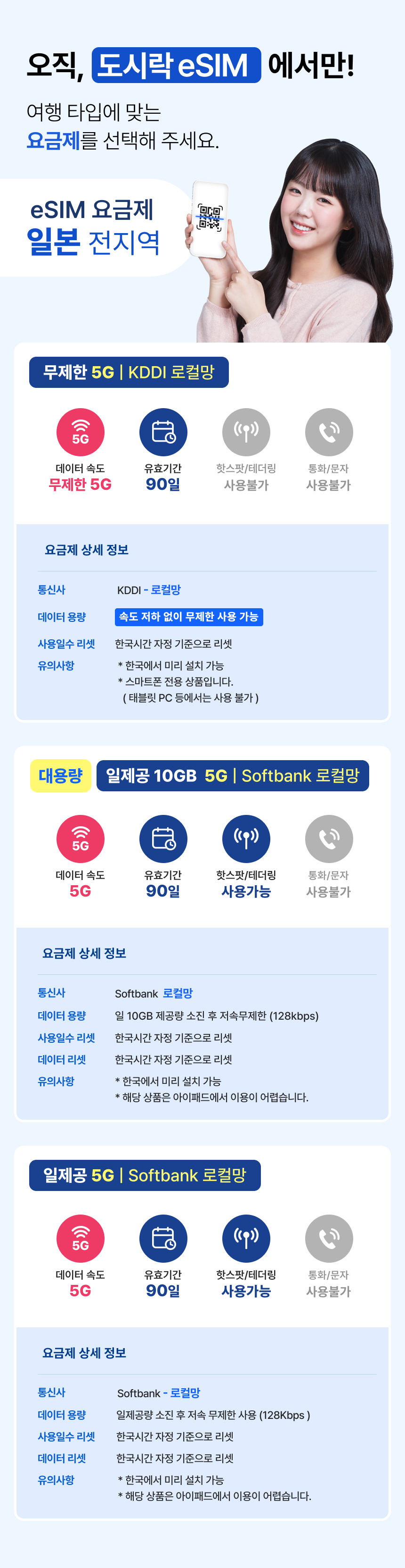 취소가능단말기에 eSIM 모듈이 탑재된 모델에서만 사용 가능합니다. 반드시 사용 가능 기종을 확인 후 구매 바랍니다. (설치 불가 사유는 환불 및 보상 불가) 상품 구매자 전원에게 도쿄역 캐릭터 스트리트 할인 쿠폰을 드려요! 쿠폰은 구매내역 페이지에서 다운로드 가능합니다. 상품 구매자 전원에게 오사카 나라 킨테츠 백화점 쿠폰을 드려요! 쿠폰은 구매내역 페이지에서 다운로드 가능합니다. 상품 구매자 전원에게 일본 빅카메라 7% 할인 쿠폰을 드려요! 쿠폰은 구매내역 페이지에서 다운로드 가능합니다. 상품 구매자 전원에게 일본 사츠도라 5% 할인 쿠폰을 드려요! 쿠폰은 구매내역 페이지에서 다운로드 가능합니다. 상품 구매자 전원에게 일본 돈키호테 최대 15% 할인 쿠폰을 드려요! 쿠폰은 구매내역 페이지에서 다운로드 가능합니다.