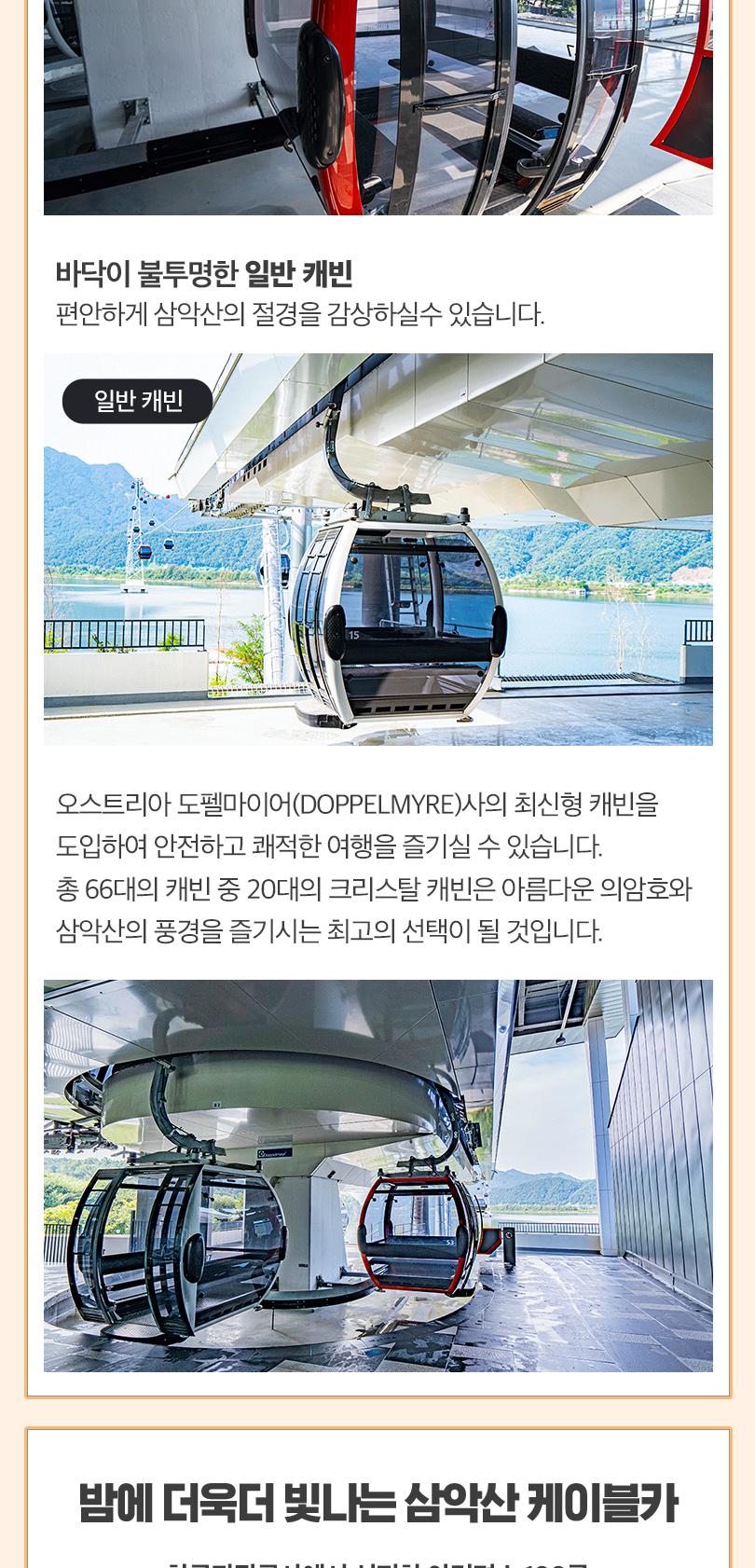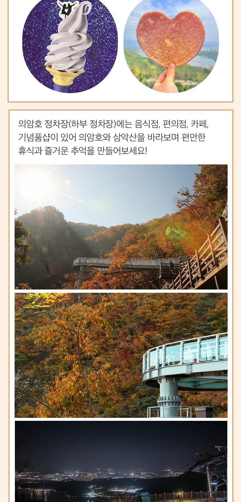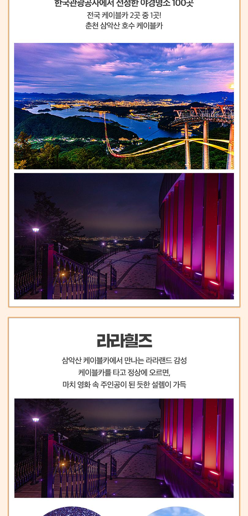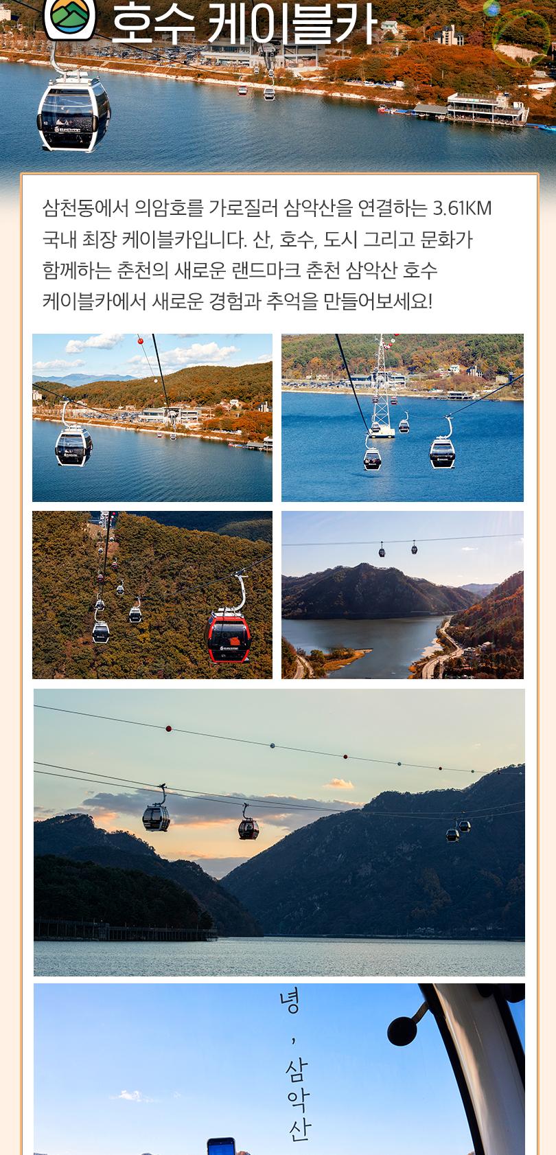 춘천의 새로운 랜드마크, 삼악산 호수 케이블카! 사랑하는 사람과 함께 행복한 추억을 쌓아볼까요? 3.61km의 국내 최장 길이를 자랑하는 삼악산 호수 케이블카! 삼천동에서 의암호를 가로지르며 춘천의 수려한 자연경관을 감상할 수 있어요. 저녁엔 더욱 분위기 있는 춘천의 야경까지! 시간대별로 달라지는 풍경을 자랑하는 삼악산의 절경을 느껴보세요. 최신형 캐빈으로 안전하고 쾌적하게 즐길 수 있어요. 춘천 여행을 떠난다면 꼭 방문해야 하는 필수 코스! 삼악산 호수 케이블카를 강력히 추천해요.