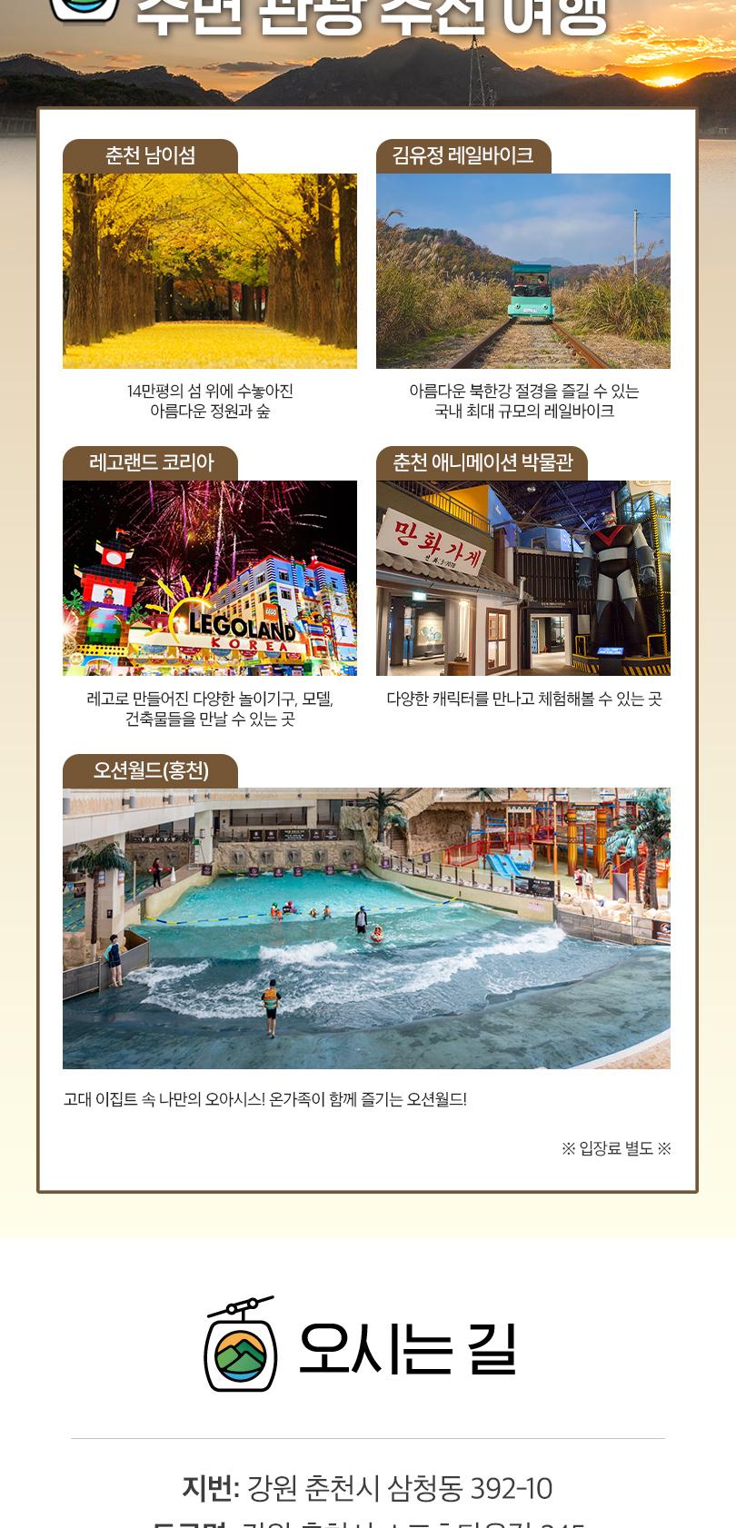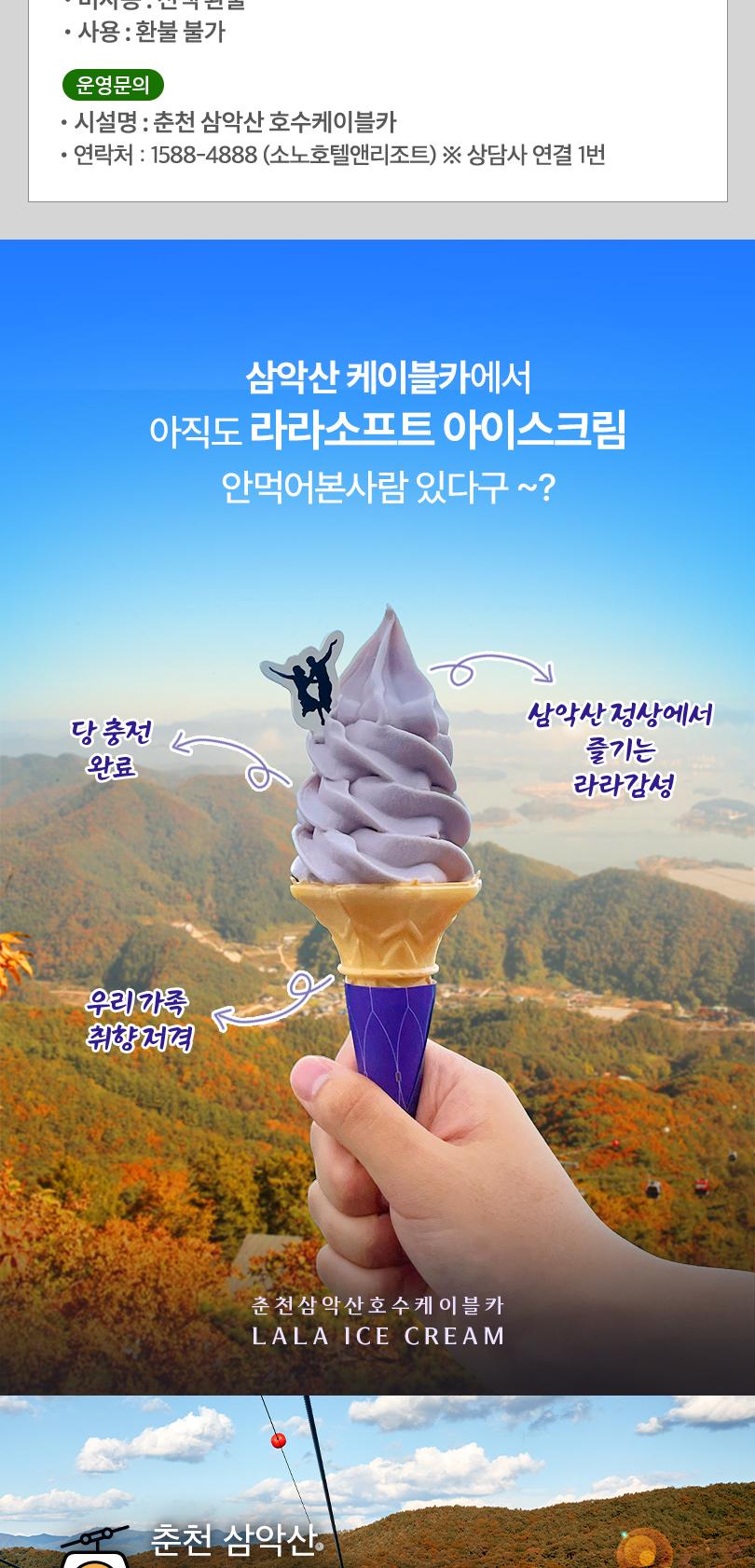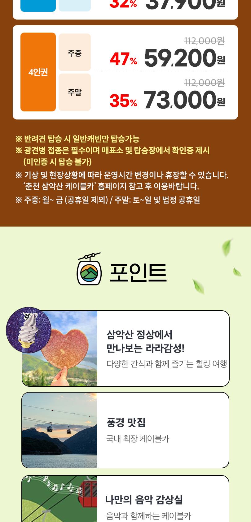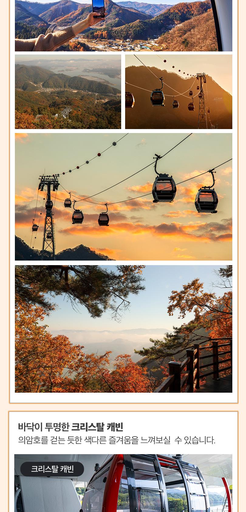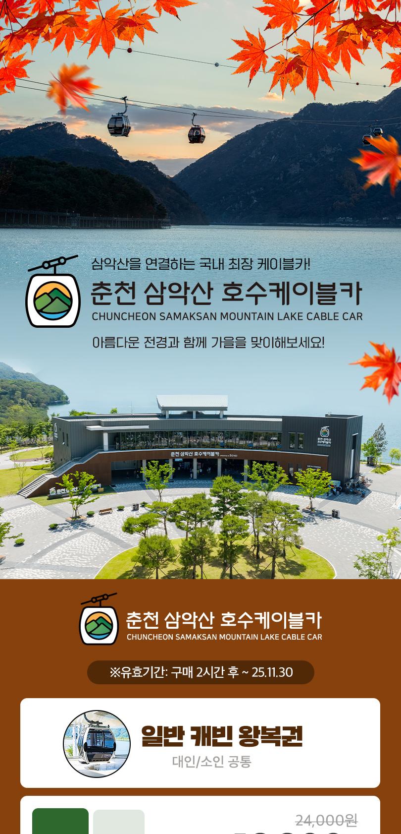 춘천의 새로운 랜드마크, 삼악산 호수 케이블카! 사랑하는 사람과 함께 행복한 추억을 쌓아볼까요? 3.61km의 국내 최장 길이를 자랑하는 삼악산 호수 케이블카! 삼천동에서 의암호를 가로지르며 춘천의 수려한 자연경관을 감상할 수 있어요. 저녁엔 더욱 분위기 있는 춘천의 야경까지! 시간대별로 달라지는 풍경을 자랑하는 삼악산의 절경을 느껴보세요. 최신형 캐빈으로 안전하고 쾌적하게 즐길 수 있어요. 춘천 여행을 떠난다면 꼭 방문해야 하는 필수 코스! 삼악산 호수 케이블카를 강력히 추천해요.