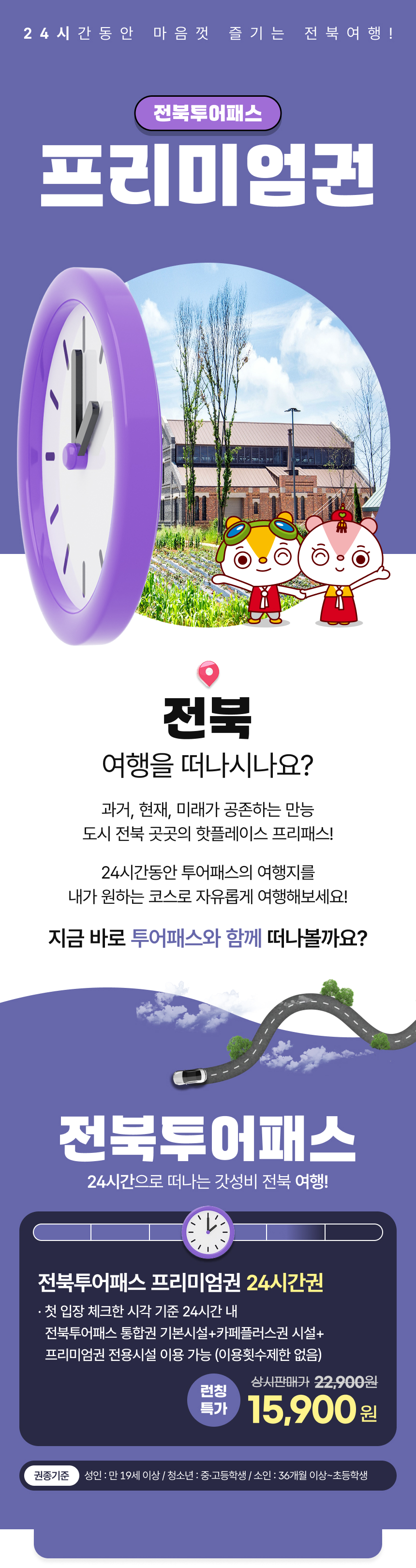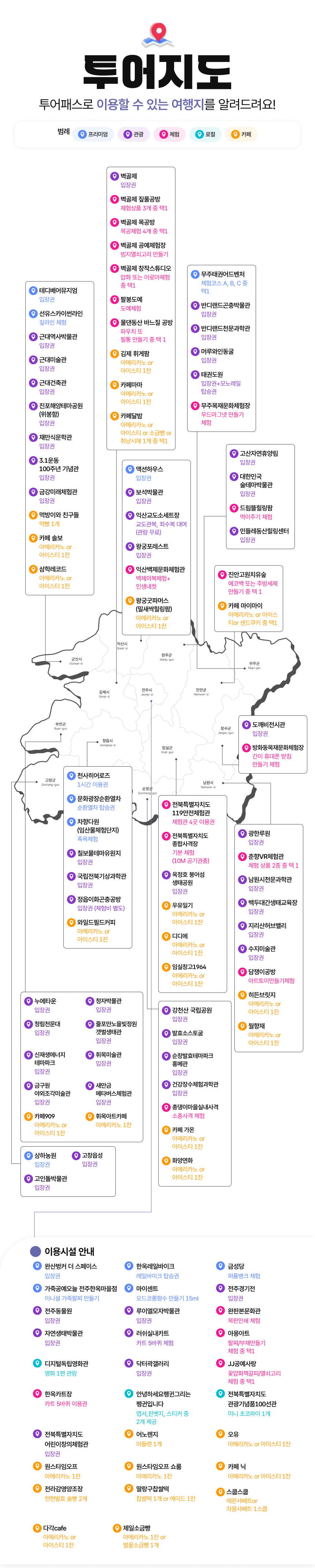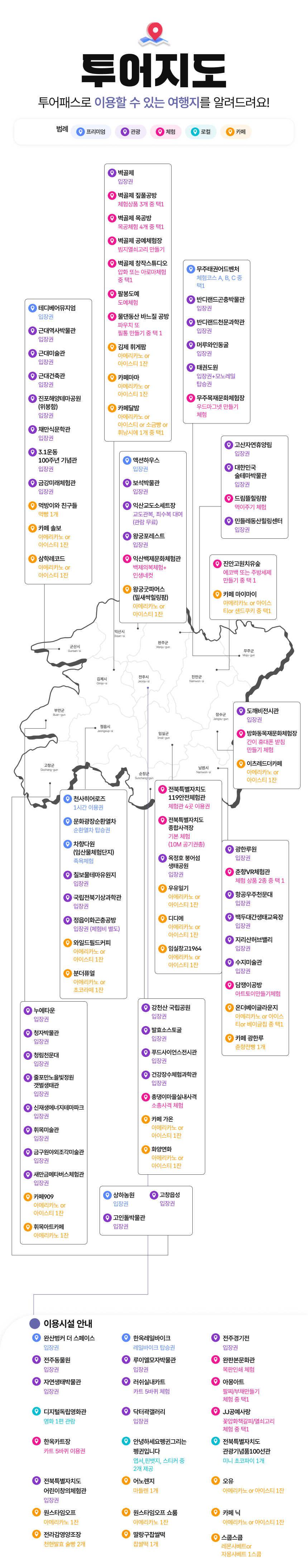 전북 여행을 계획 중이신가요? 24시간으로 떠나는 가성비 투어패스를 소개할게요. 첫 입장 체크한 시각 기준 24시간 내 통합권에 포함된 기본시설은 물론이고, 카페 플러스권의 시설과 프리미엄 전용 시설을 함께 이용할 수 있어요. 24시간 동안 무제한으로 다양한 관광지를 여행하고 커피 한 잔의 여유까지, 완벽한 여행을 만들어 보세요. 합리적인 가격으로 전북 여행을 떠나는 최고의 방법! 전북 투어패스 프리미엄권과 함께하세요.