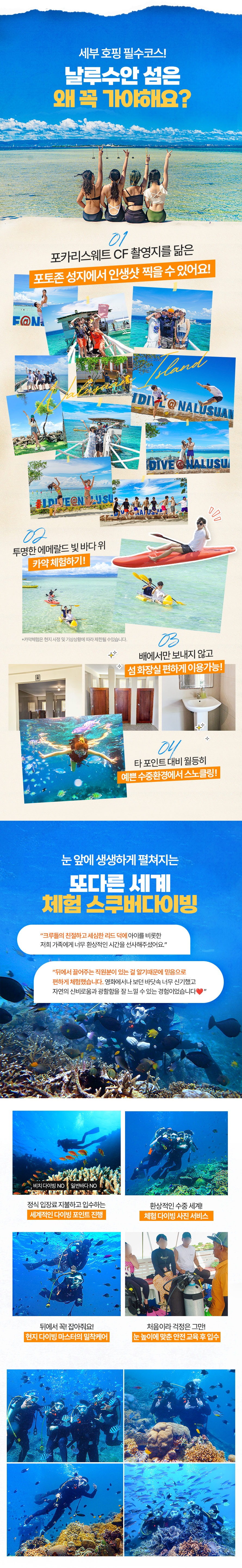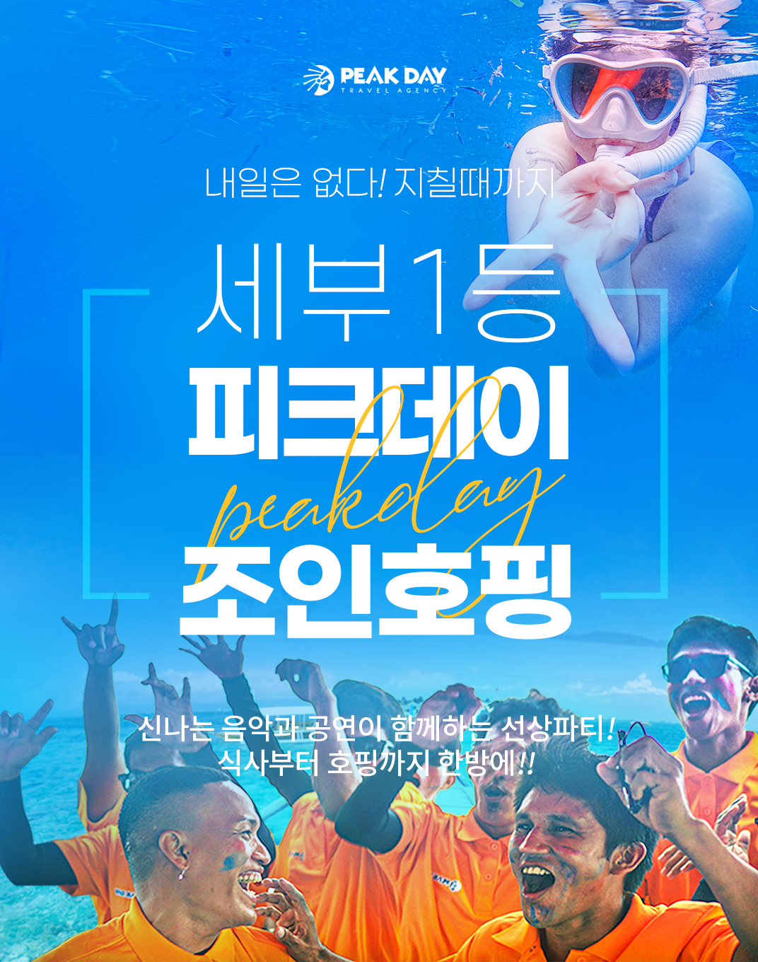 세부에서 가장 잘 노는 녀석들만 모인 피크데이 호핑을 와그 단독 할인 가격에 예약할 수 있어요. 알차게 꽉 채운 세부 감성! 날루수안 / 힐루뚱안에서 알록달록 열대어까지 스노클링을 즐길 수 있어요. 푸짐한 간식과 식사가 제공되며, 특별한 레크리에이션과 화끈한 럼콕 파티까지! 왜 호핑투어라면 피크데이인지 아실 수 있을 거예요!