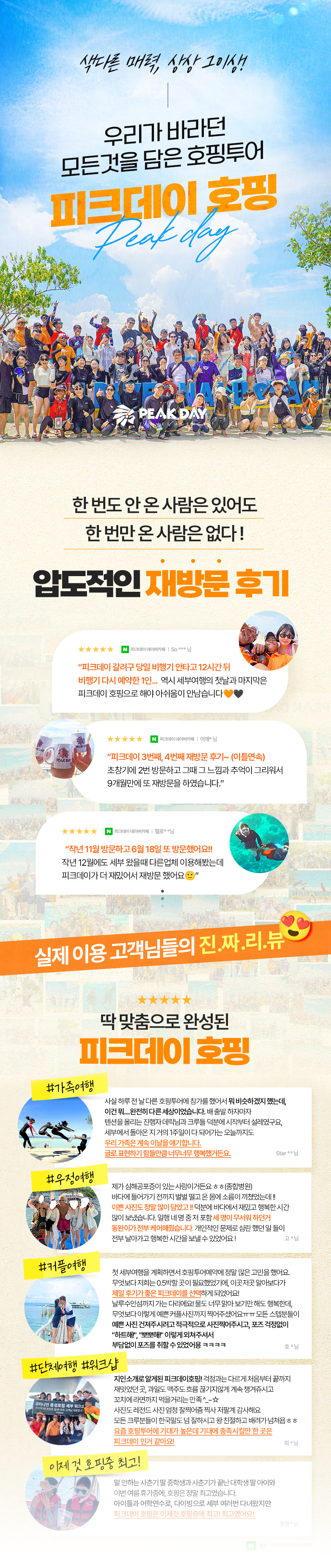 베스트와그 피크데이 완전!!! 강추강추!!! 친구랑 둘이 갔는데 다이빙도 하고 즐겁게 놀다 왔습니다 일단 카바나레스토랑 가는 호핑업체가 없던데 뷰좋은 레스토랑에서 식사 완전 굿굿! 시작부터 환영해주는 우리 필리핀친구들~♡ 필리핀친구들 공연도 진짜 환상이였습니당!! 세부여행 처음인데 피크데이 호핑하러 다시오려고여 ㅋㅋㅋㅋㅋㅋ 저희가 코로나 이후 4번째 호핑이였다는데 진짜 세심한부분까지 잘 케어해주셔서 너무 감사했습니다. 진짜 강추에요!!