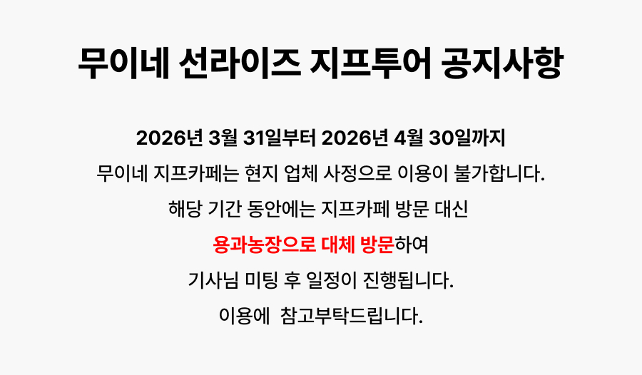 나트랑 근교에 위치한 유명한 무이네! 아름다운 무이네의 해돋이를 직접 눈 앞에서 만날 수 있고 지프차를 타고 무이네의 사막을 신나게 드라이브하는 특별한 경험도 할 수 있는 사막 투어예요. 또한 현장에서 추가 요금을 내면 화이트 샌듄에서 ATV도 타볼 수 있어요!