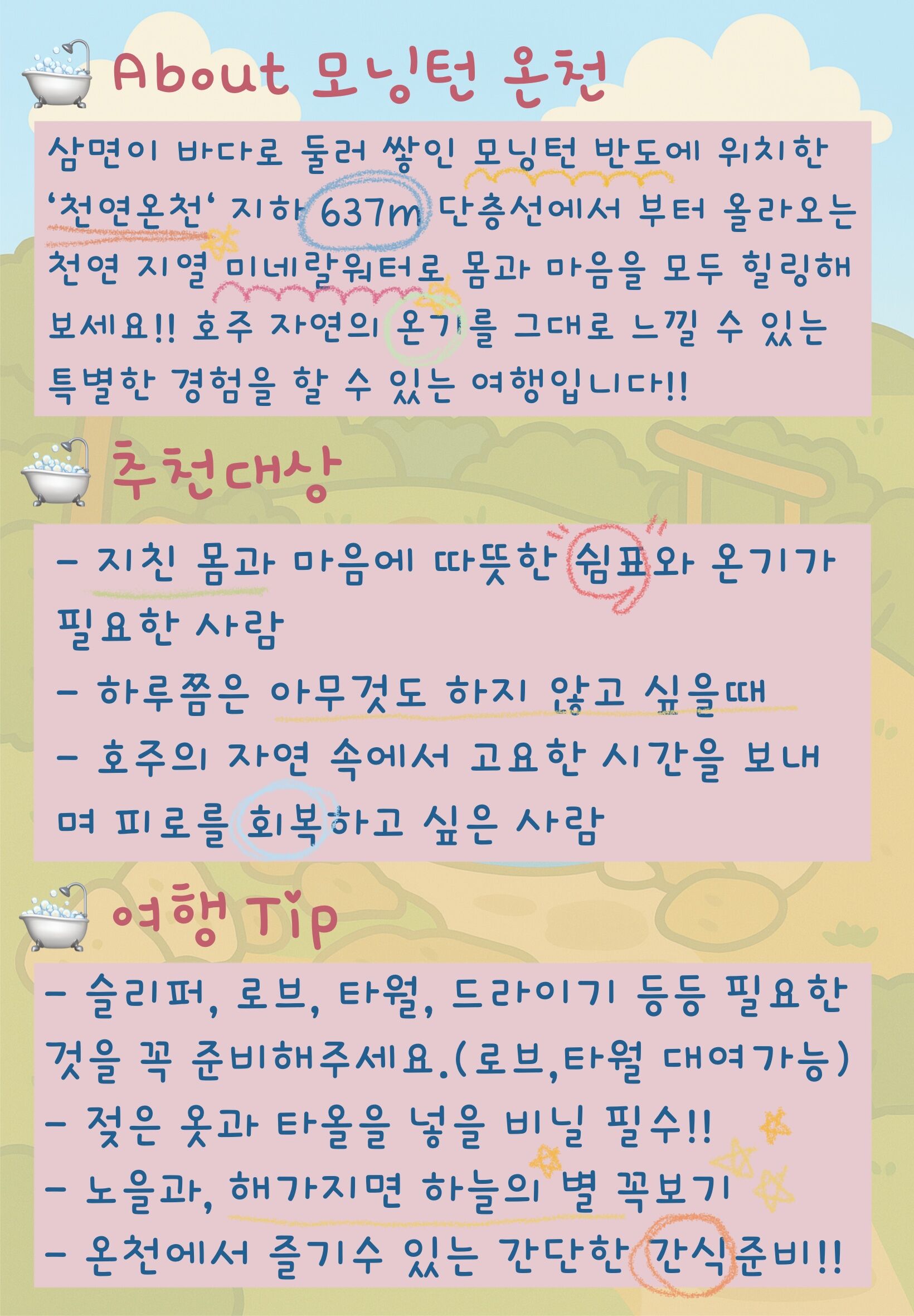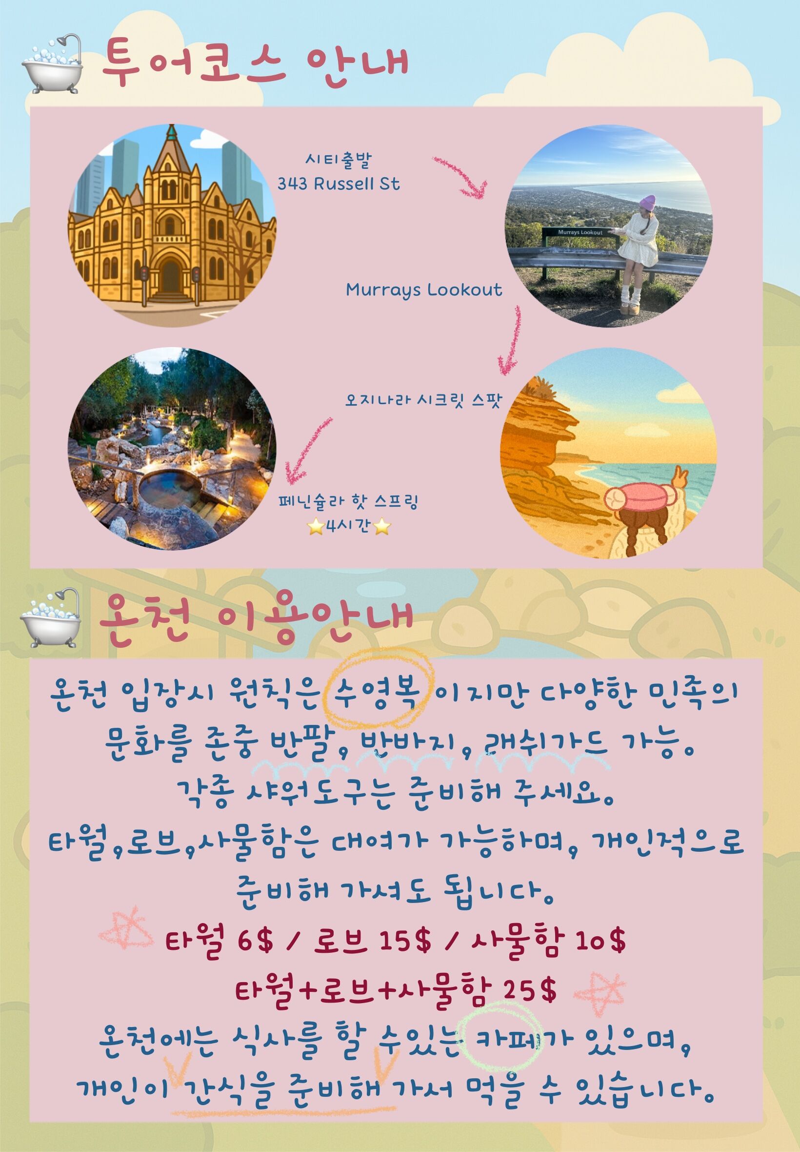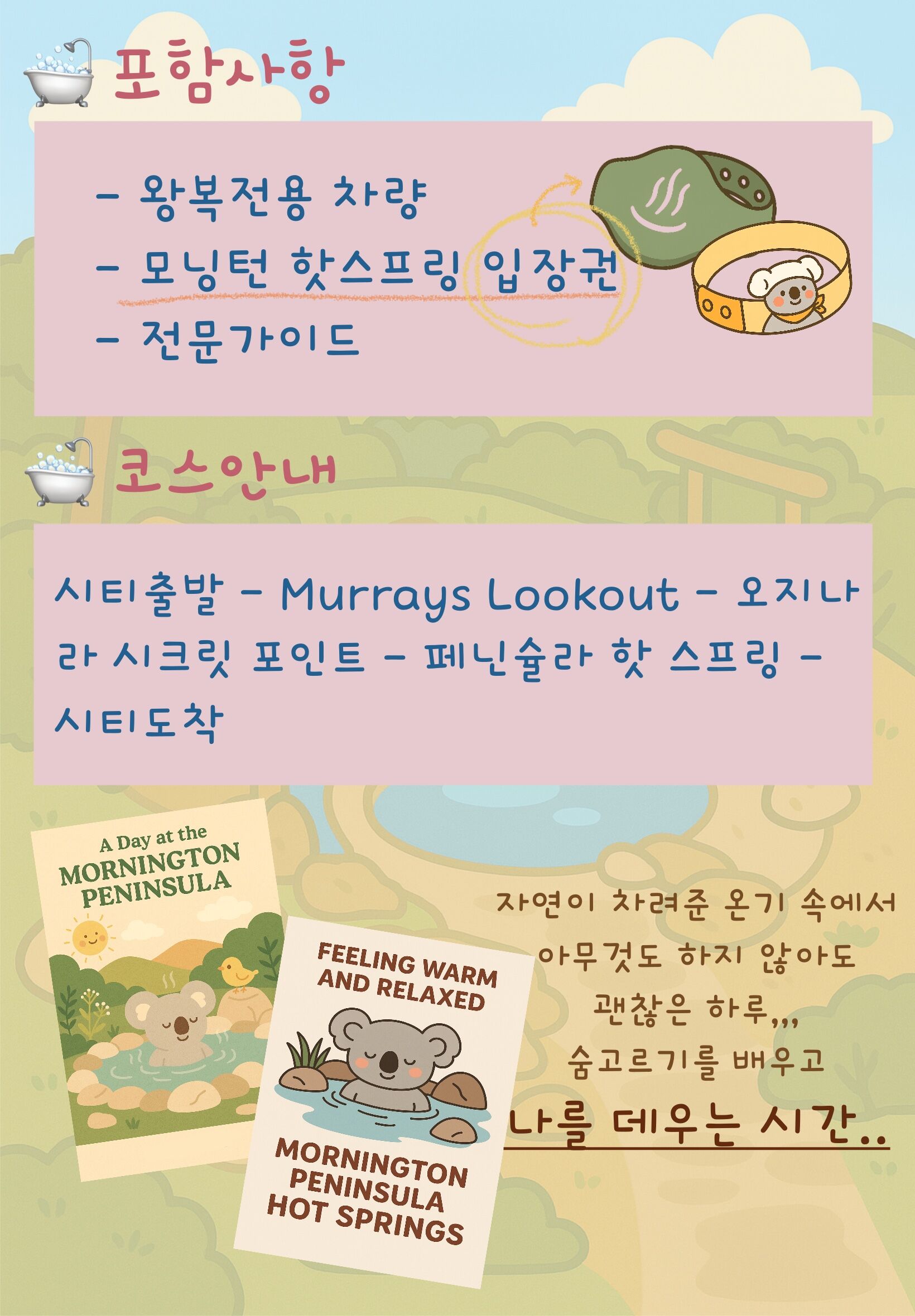 모닝턴 페닌슐라 자연 속에서 미네랄이 풍부한 온천을 사용하며, 아름다운 호주의 자연 속에서 즐기는 야외 노천 온천이에요. 미네랄이 풍부한 따뜻한 온천에서 멋진 경치도 감상하시고, 여독도 함께 푸는 힐링타임을 가져보세요!