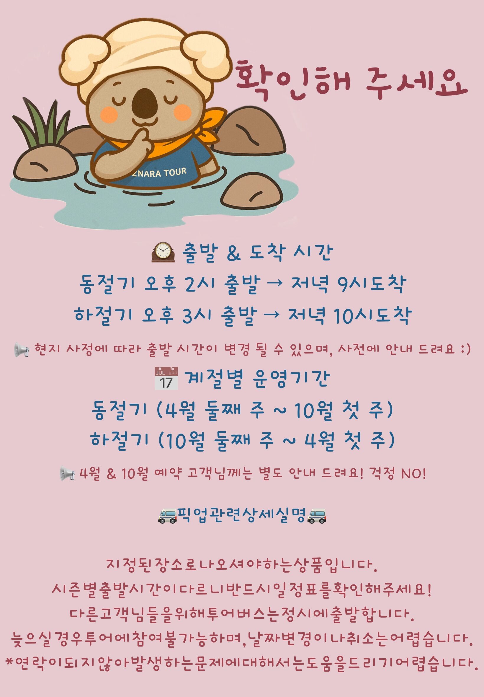 계절과 투어 진행 상황에 따라 미팅시간이 상이해요. 정확한 미팅시간 확인을 위해 바우처를 참고해주세요.