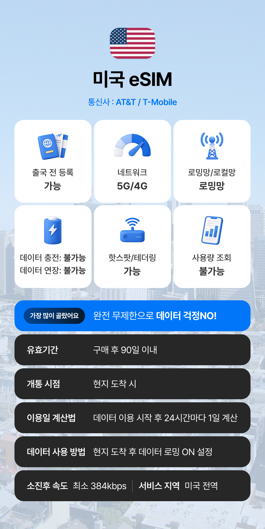 해외여행 중 필수로 필요한 데이터! 해외여행을 편안하게 시작하고 싶다면, 미국 데이터 무제한 eSIM을 추천해요. 유심사 eSIM은 미국 통신사 Verizon과 T-mobile 네트워크를 이용해요. 즉시 발송되는 QR코드를 스캔해 간단한 등록으로 바로 사용할 수 있어 편리하고, 내 여행 일정에 사용 일수를 맞추어 구매할 수 있어요.