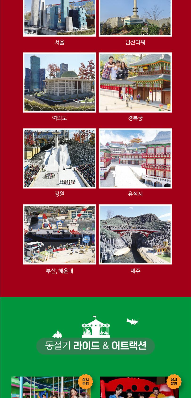 세계에서 일곱 번째로 규모가 큰 레고랜드이자 아시아 최대 규모의 레고랜드, 춘천 레고랜드를 방문해 보세요. 레고랜드 코리아는 브릭 스트리트, 브릭토피아, LEGO® 캐슬, LEGO® NINJAGO® 월드, 해적의 바다, LEGO® 시티, 미니랜드 등 총 7개의 테마구역으로 이루어져 있어요. 레고랜드에서 가장 빠른 열차인 스릴이 넘치는 더 드래곤, 아이들에게 신호등의 개념을 느끼게 해주는 드라이빙 스쿨, 4D를 감상할 수 있는 4D시네마, 3D안경을 끼고 게임 대결을 할 수 있는 닌자고 더 라이드, 대한민국 명소를 레고로 재현한 미니랜드 등 다채로운 레고랜드만의 어트랙션을 모두 직접 만나보세요. 중간중간 브릭 카페에서 핫초코와 와플로 당 충전하면 추위도 잊게 돼요. 해가 지면 공원 전체가 라이트업되어 로맨틱한 산책 코스로 변신✨