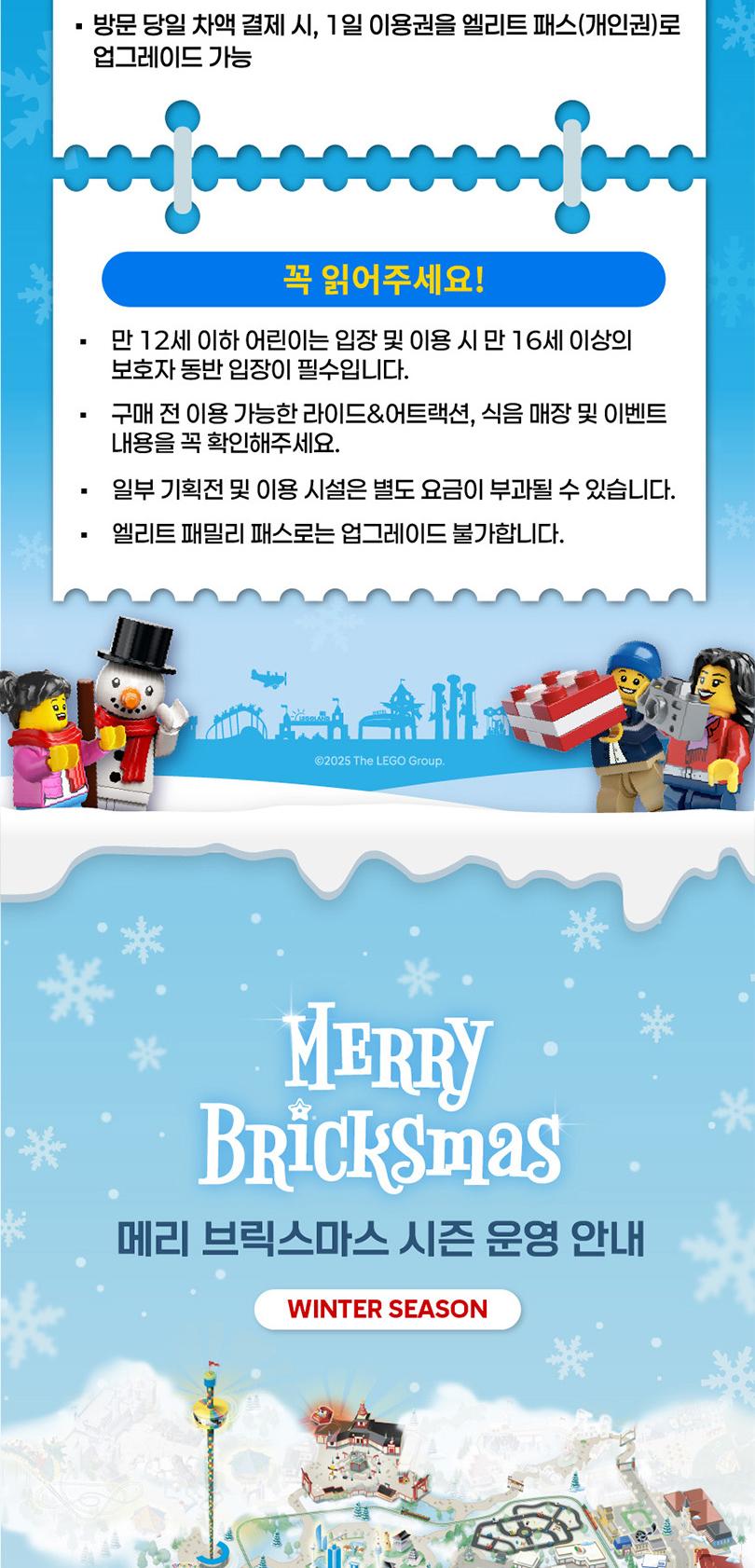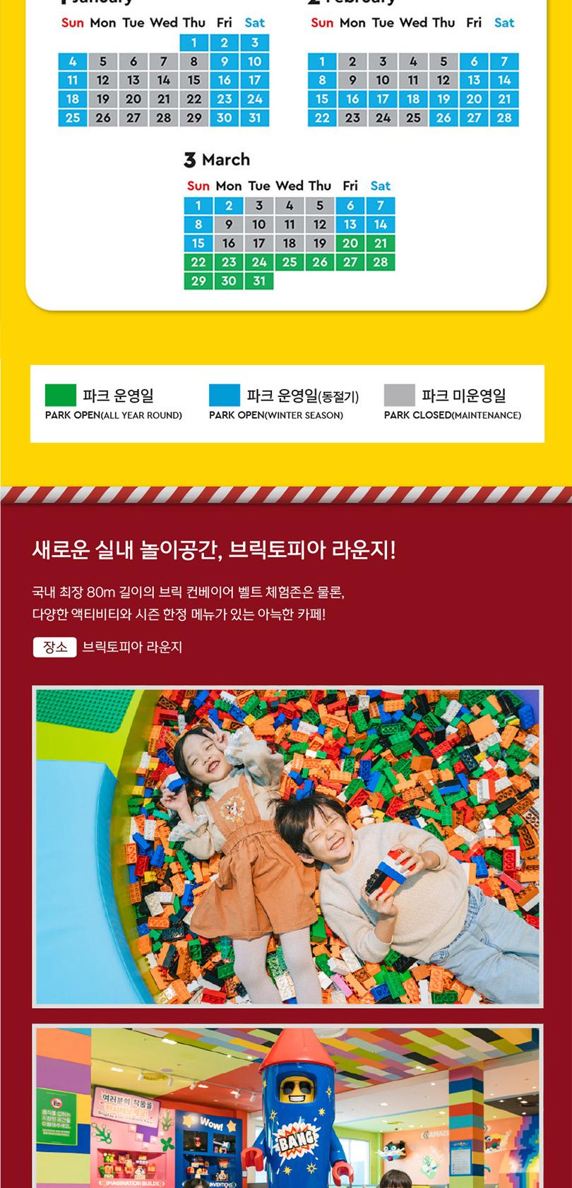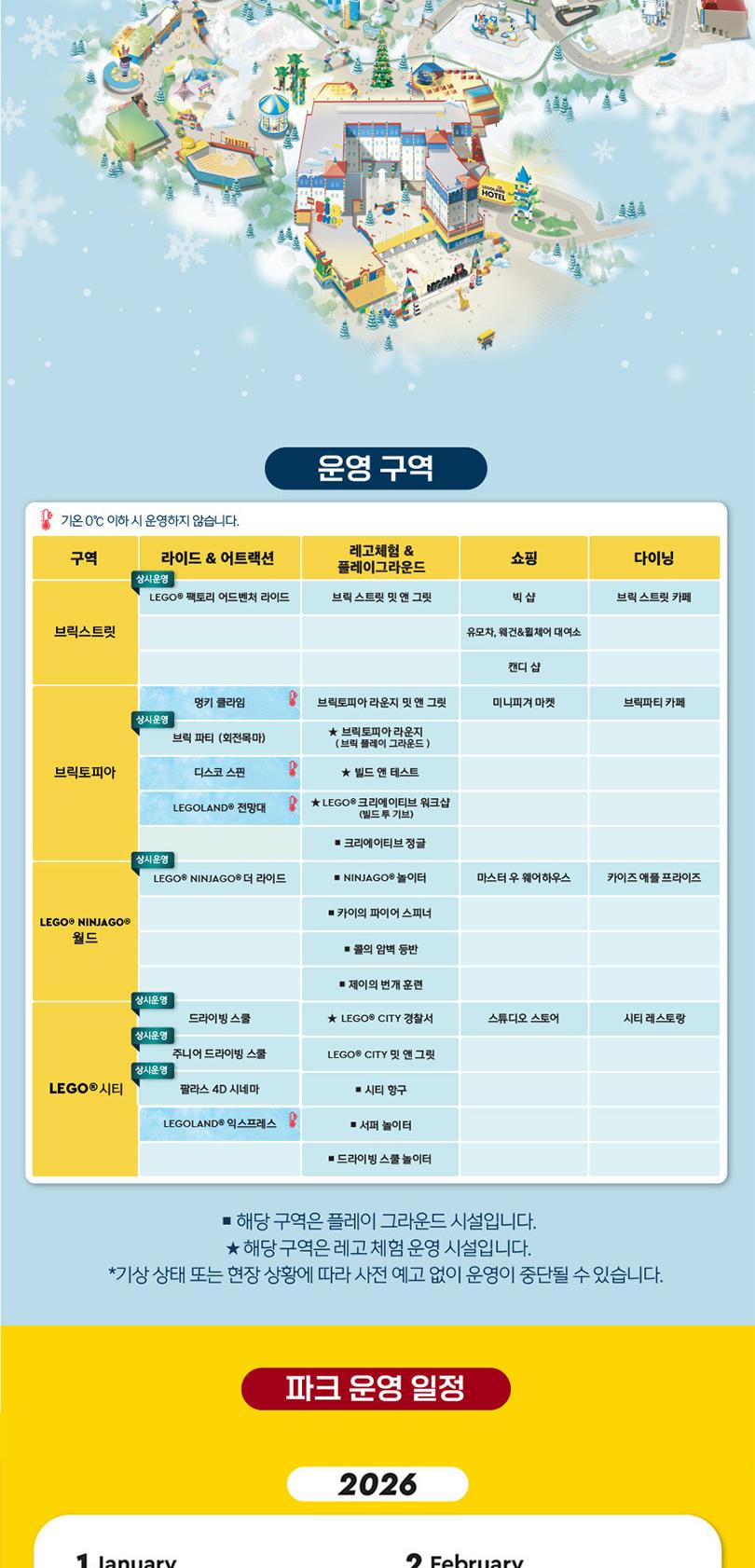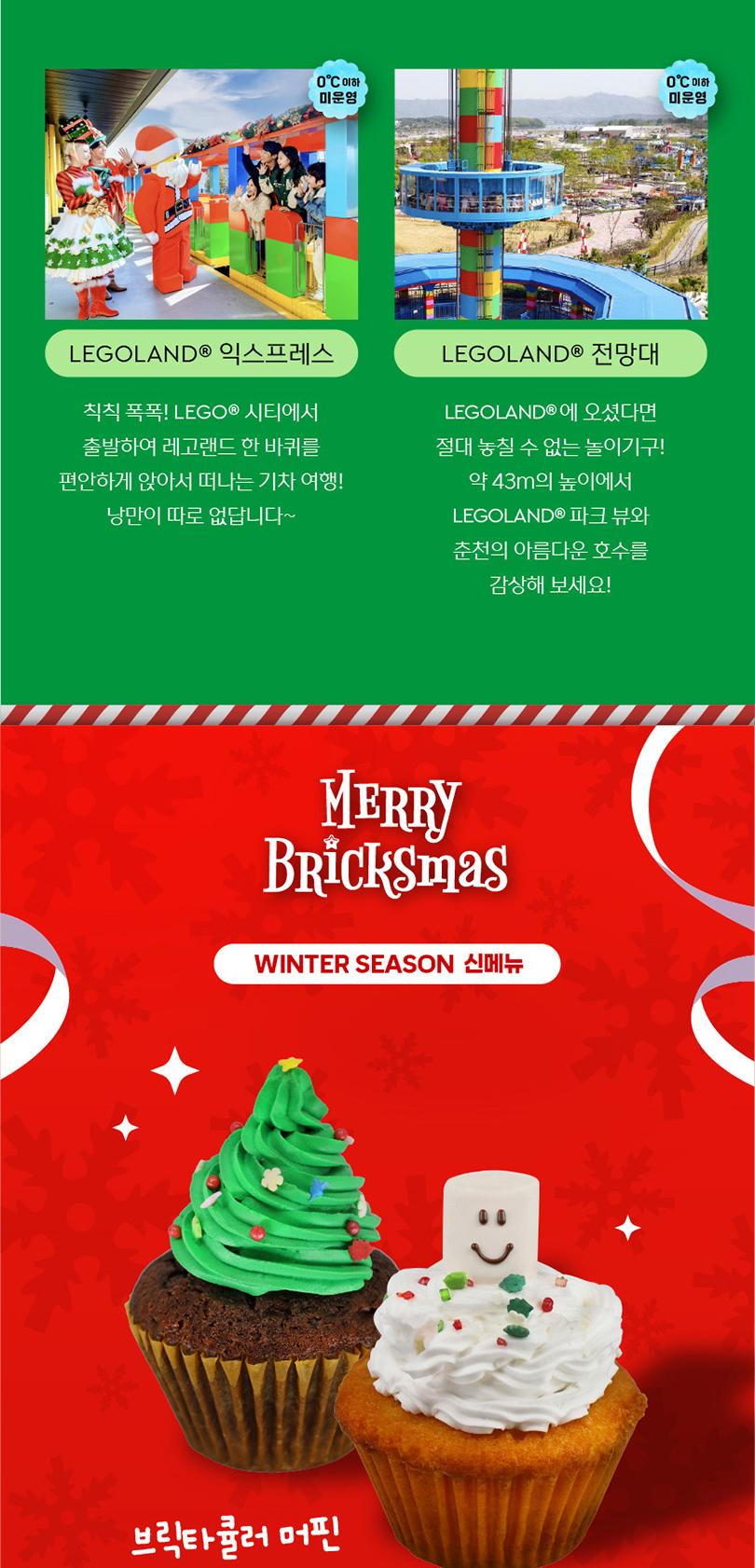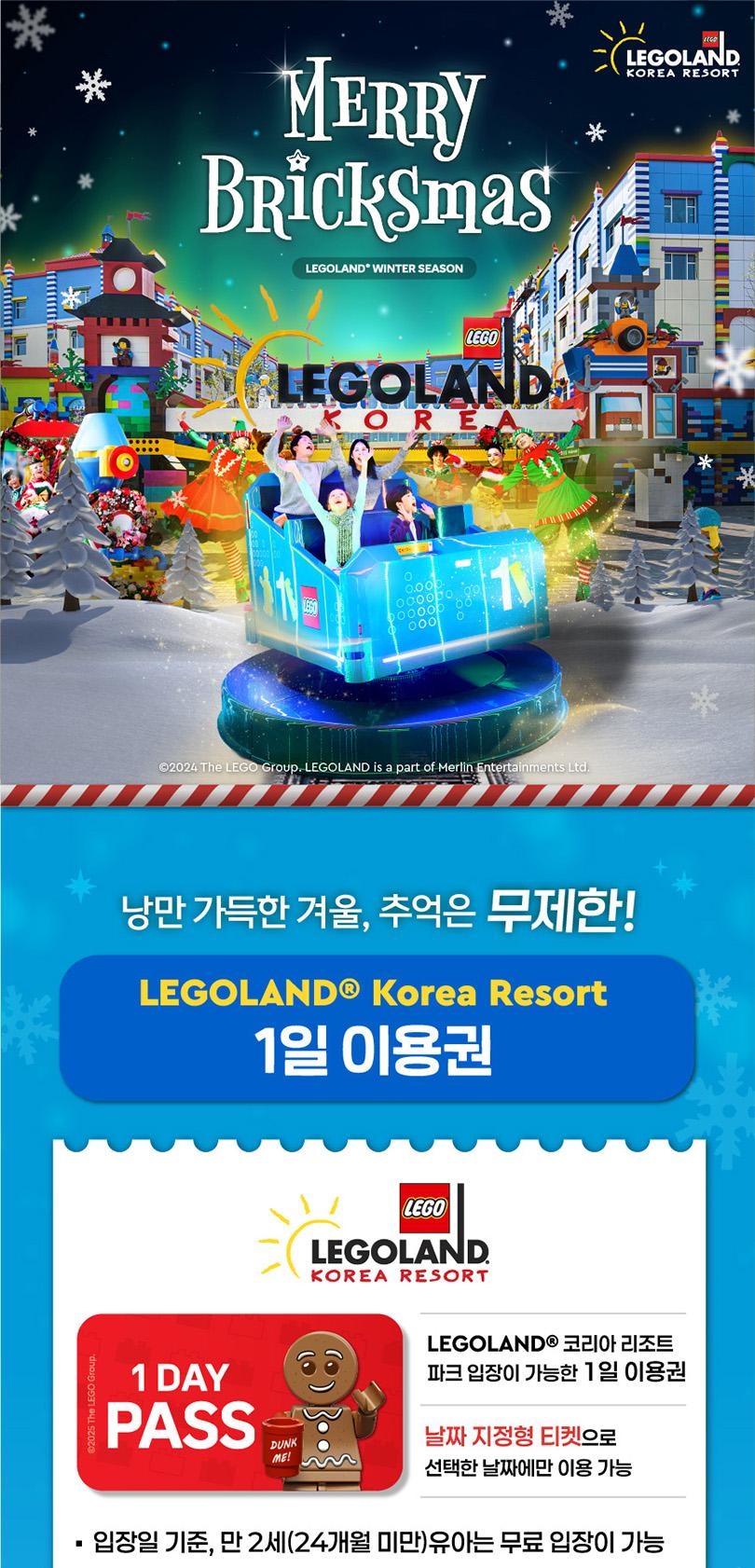 한국어 제공겨울에도 설렘은 계속! 눈 내린 섬 위에서 즐기는 춘천 레고랜드 ❄️🧱 아시아 최대 규모 레고 월드, 지금만 만날 수 있는 특가 혜택으로 즐겨보세요! 💙 판매기간 : 2026.01.01 ~ 2026.01.31 유효기간 : 2026.01.02 ~2026.02.28