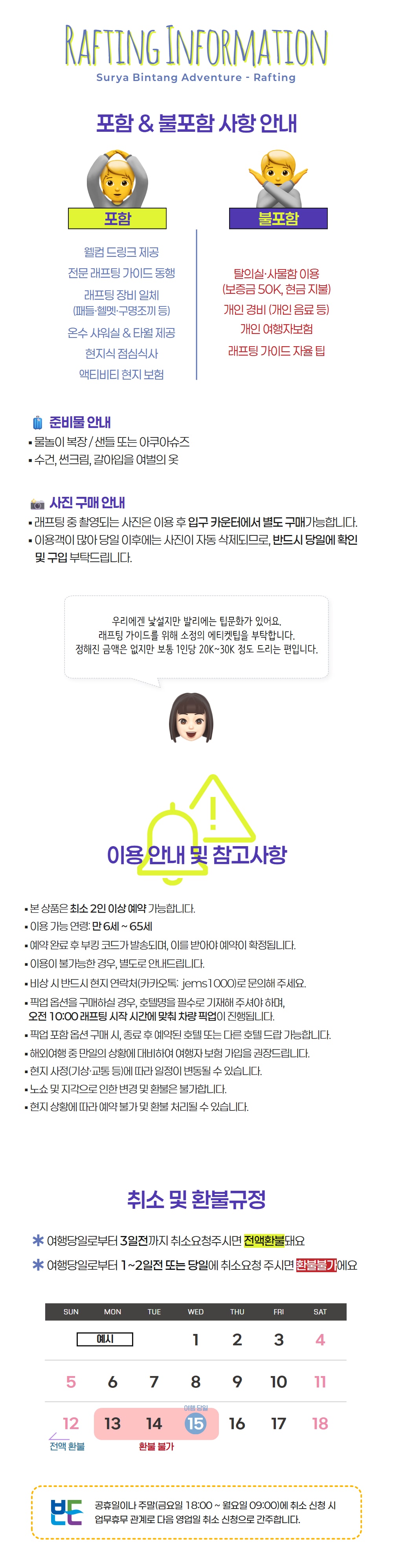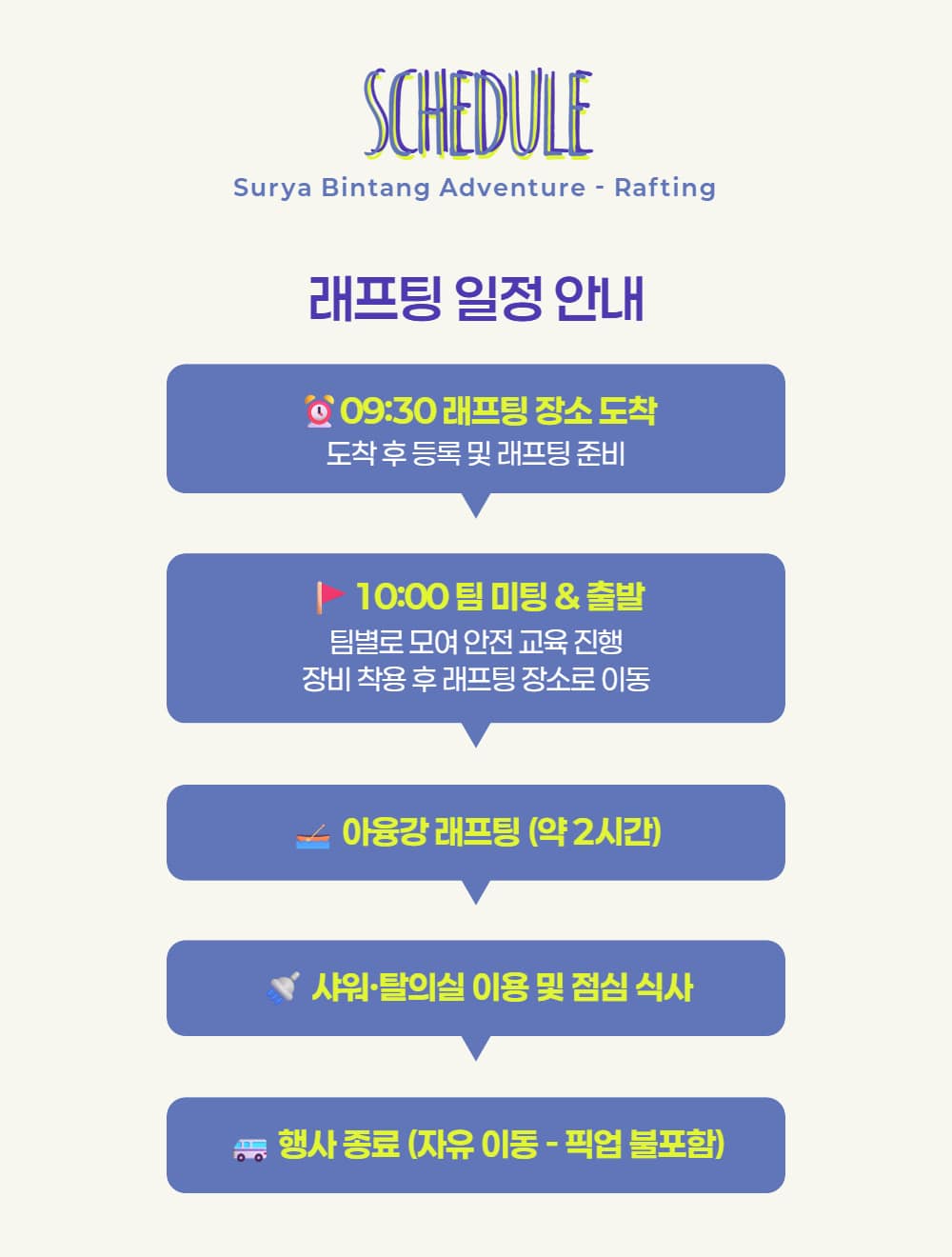 * 래프팅 시간에 맞춰 차량 픽업이 진행됩니다. 예약 시 희망 시간을 선택해 주세요.