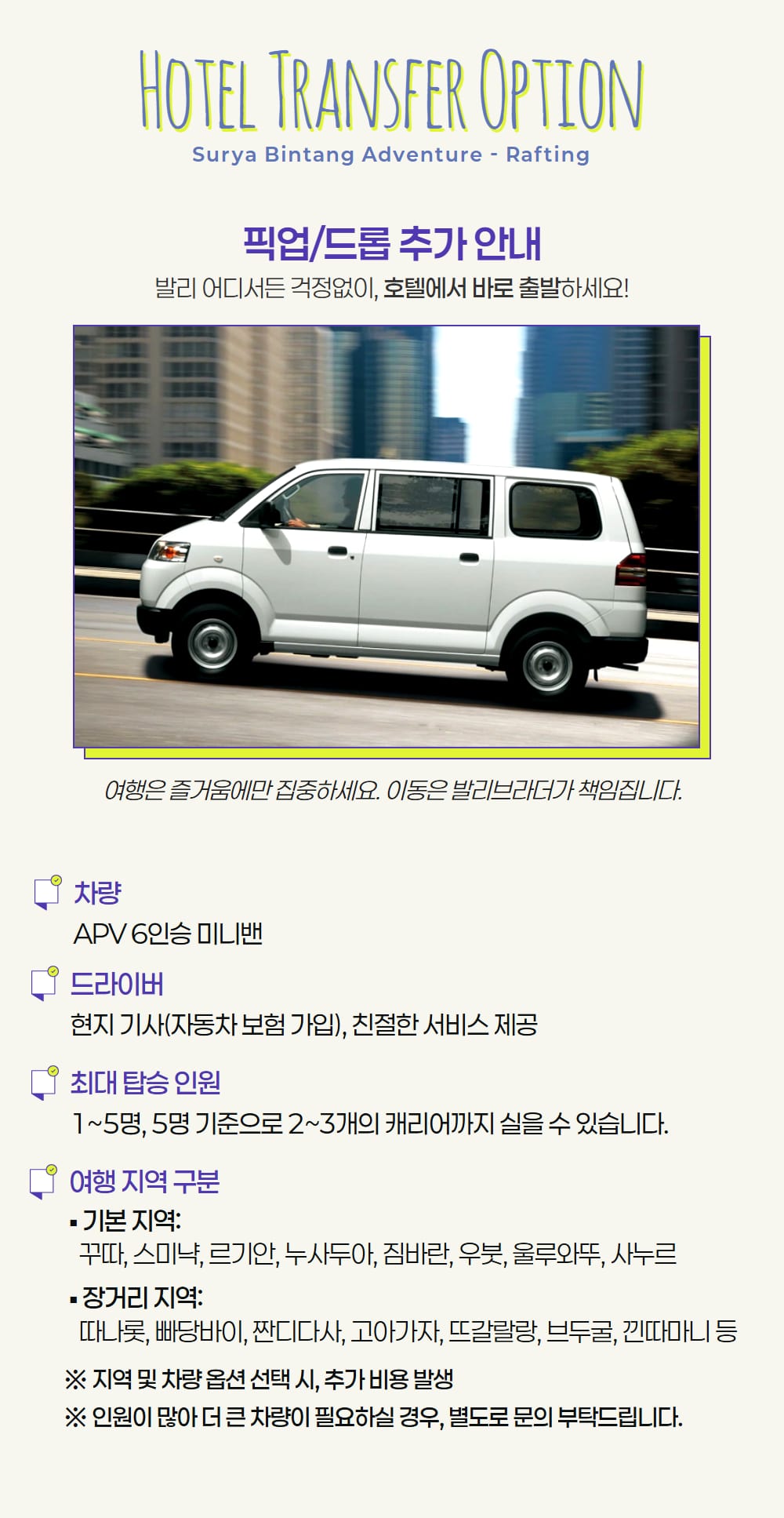 *당일 이용하는 차량 기사님 연락처 필수로 카카오톡채널 "발리브라더"로 연락 부탁드립니다.