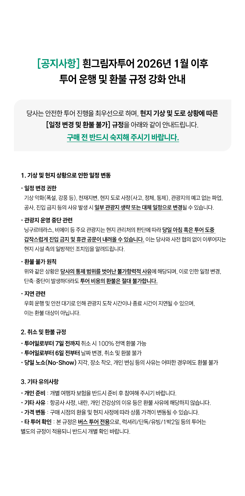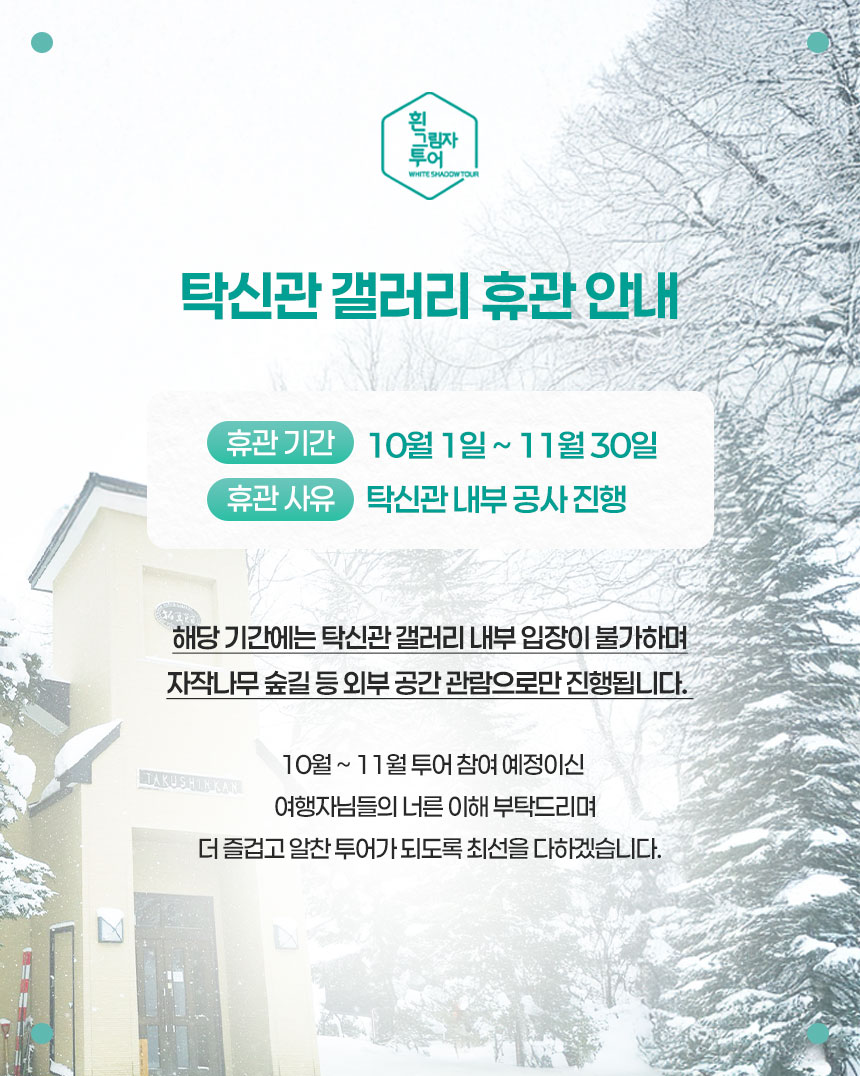 스스키노에서 출발하기 때문에 미팅 장소로 이동하기 편리하고, 오전 9시 30분에 출발하는 투어로 타 투어에 비해 여유로운 아침 시간을 보내실 수 있어요. 게다가 출고된 지 1년 미만인 신형 버스로 운행하니 이동하는 내내 쾌적함은 물론 편안함까지! 무엇보다 비에이에서 가장 유명한 핫플 식당 '준페이'를 바로 입장할 수도 있으니 흰그림자 투어와 함께 잊을 수 없는 하루를 완성해 보세요!