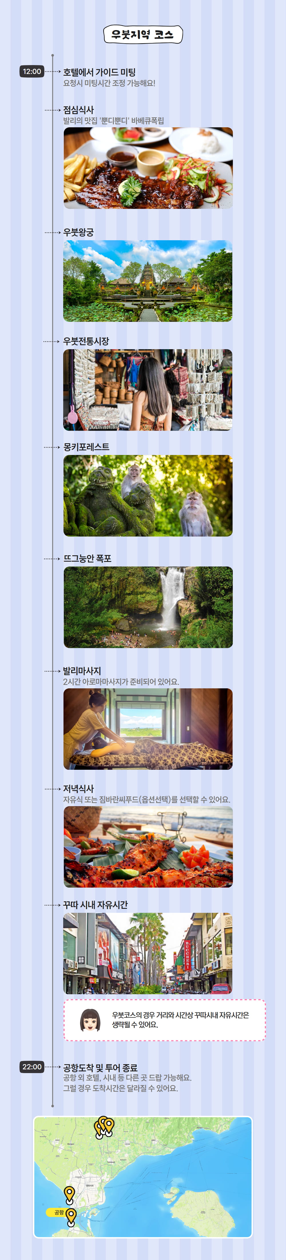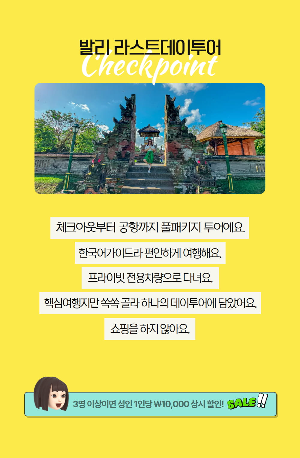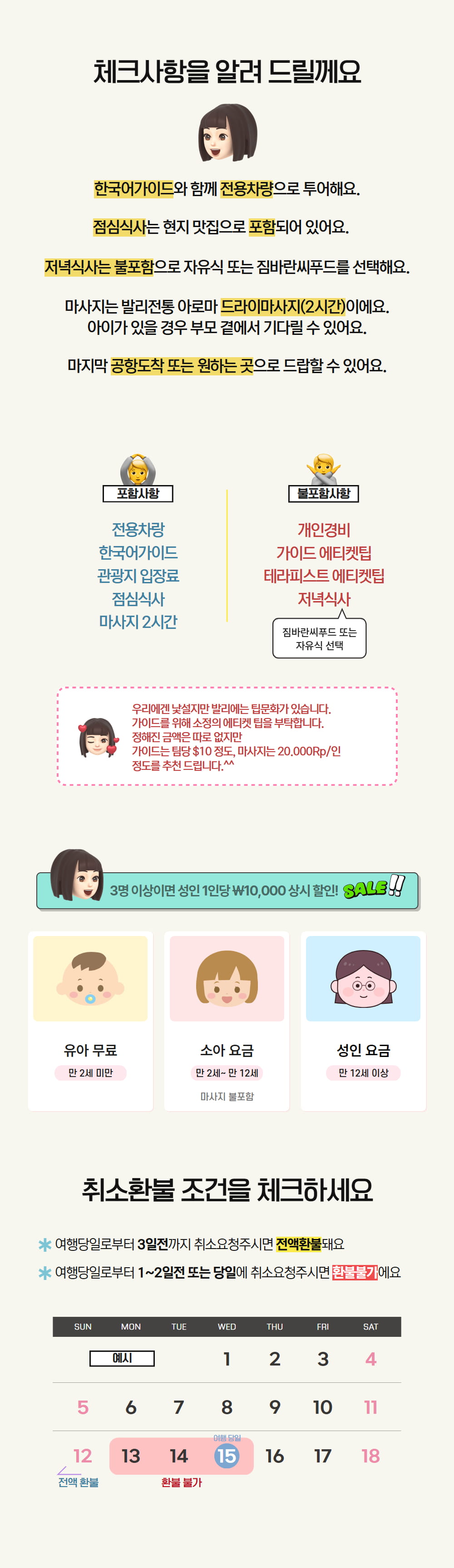 한국으로 가기 전, 짧은 시간동안 발리를 더 재밌게 즐기고 싶다면 추천하는 라스트 데이 투어에요. 한국어 사용이 가능한 현지인 가이드님과 일행들끼리만 이용 가능한 단독 차량, 관광과 피로를 풀 수 있는 시원한 마사지까지 모든 게 포함되어 있는 알찬 구성의 투어로 합리적인 가격을 자랑한답니다.