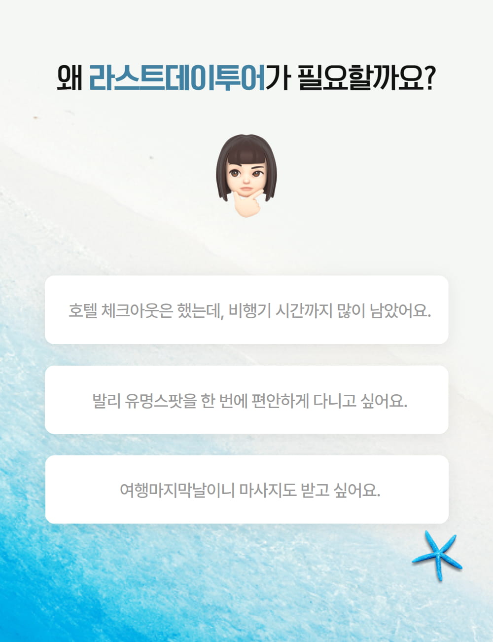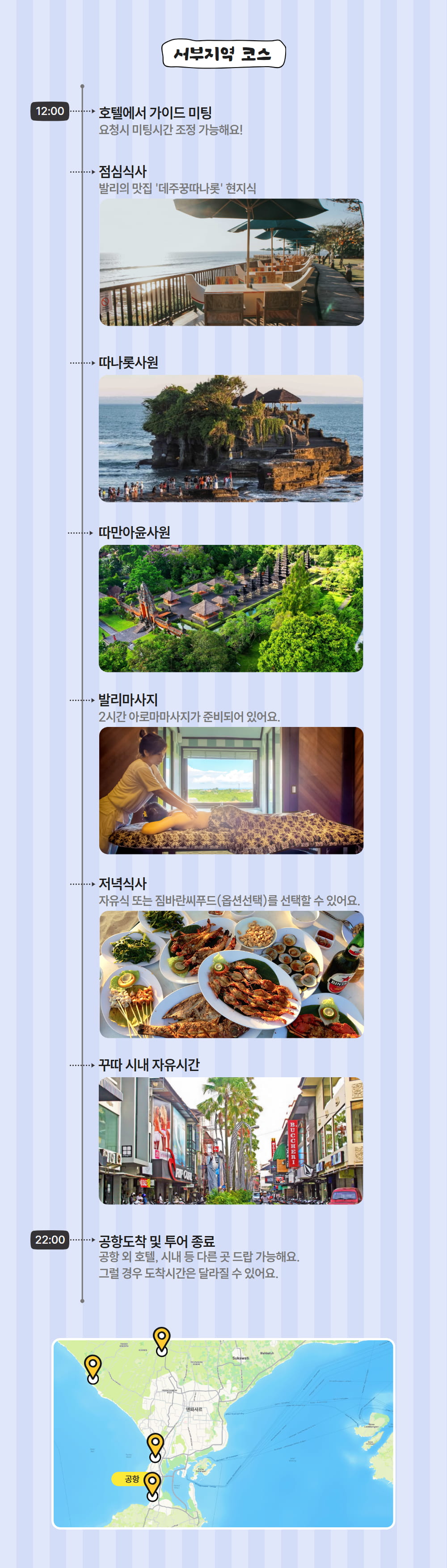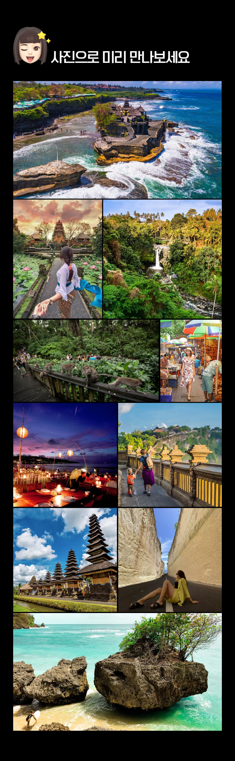 한국으로 가기 전, 짧은 시간동안 발리를 더 재밌게 즐기고 싶다면 추천하는 라스트 데이 투어에요. 한국어 사용이 가능한 현지인 가이드님과 일행들끼리만 이용 가능한 단독 차량, 관광과 피로를 풀 수 있는 시원한 마사지까지 모든 게 포함되어 있는 알찬 구성의 투어로 합리적인 가격을 자랑한답니다.