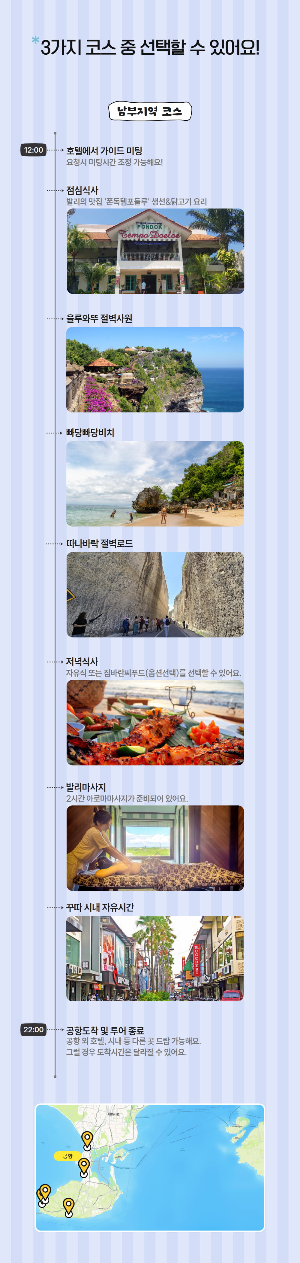 발리에서 가장 유명한 사원인 울루와뚜부터 빠당빠당 비치와 선택 옵션에 따라 즐기는 짐바란 시푸드까지 완벽하게 힐링되는 시간을 보내보세요!