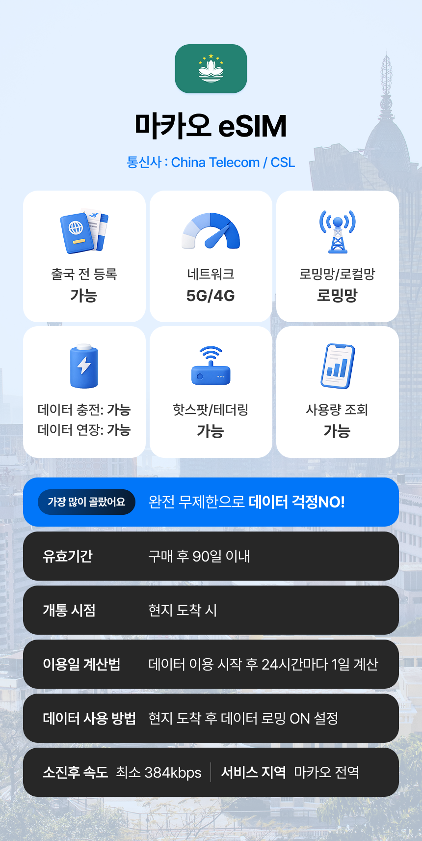 무제한 데이터로 여유롭게 해외 여행을 즐겨보세요! 마카오에서 편리하게 데이터를 사용해 인터넷을 이용하고 싶다면 데이터 무제한 eSIM을 추천해요. eSIM의 유효기간도 메일 발송일로부터 6개월간 사용할 수 있기에 자신이 원하는 날짜에 편리하게 이용할 수 있어 좋아요.
