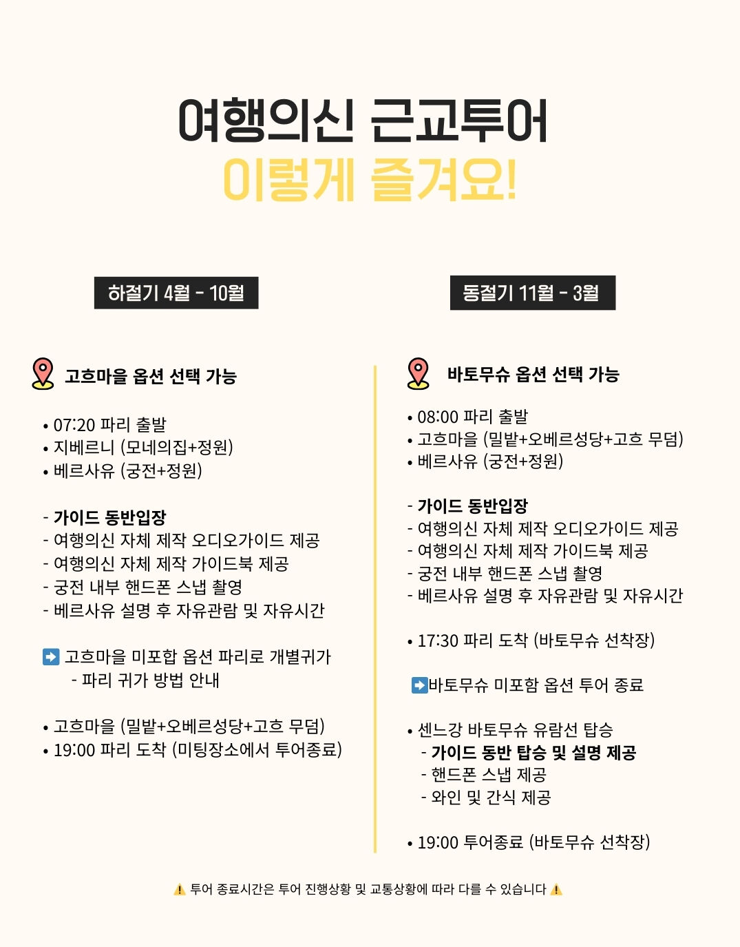 👉 지베르니와 베르사유 궁전(대행 요청시), 유람선 등 입장료는 '투어당일', 담당가이드에게 유로(현금) 또는 한화송금으로 지불해주세요!