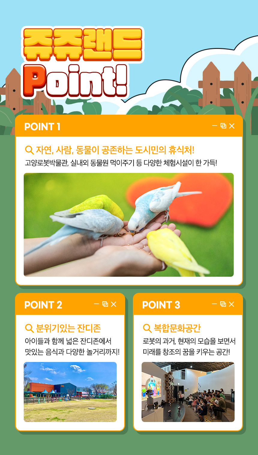 동식물 친환경 공원과 로봇 박물관이 준비된 쥬쥬랜드는 실내 및 야외 동물원을 통해 다양한 파충류 친구들과 귀여운 동물들을 만날 수 있어요. 또한 차세대 산업인 다양한 로봇기술을 체험하며 혁신적인 미래형 인재에 한걸음 다가가세요. 그 외에도 글램핑 및 수영장, 키즈카페 등 다양한 액티비티도 준비되어 있으니 꼭 방문하세요!