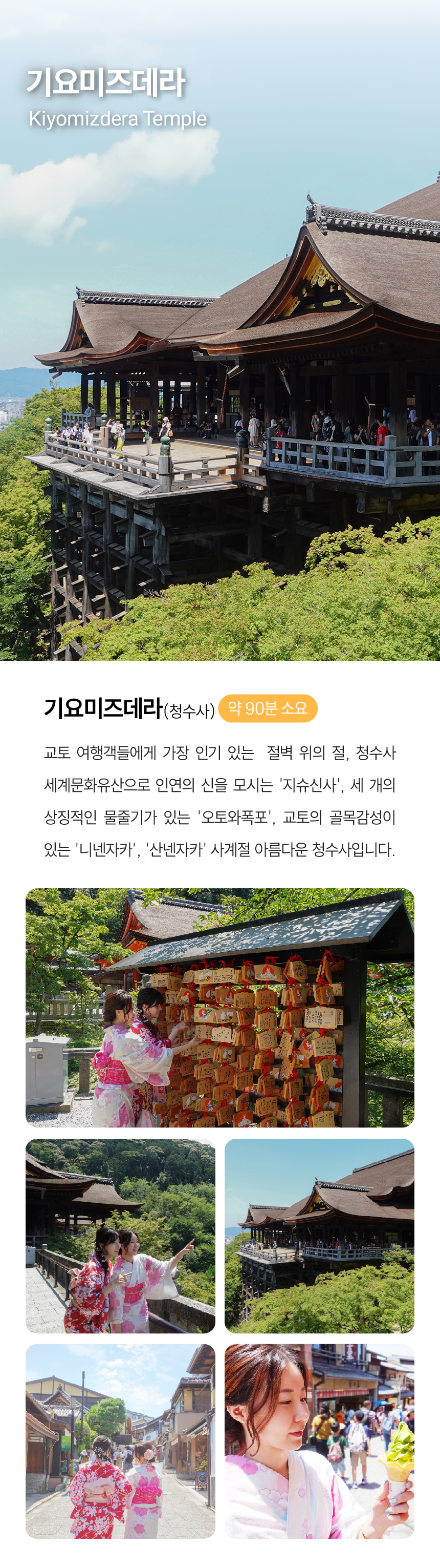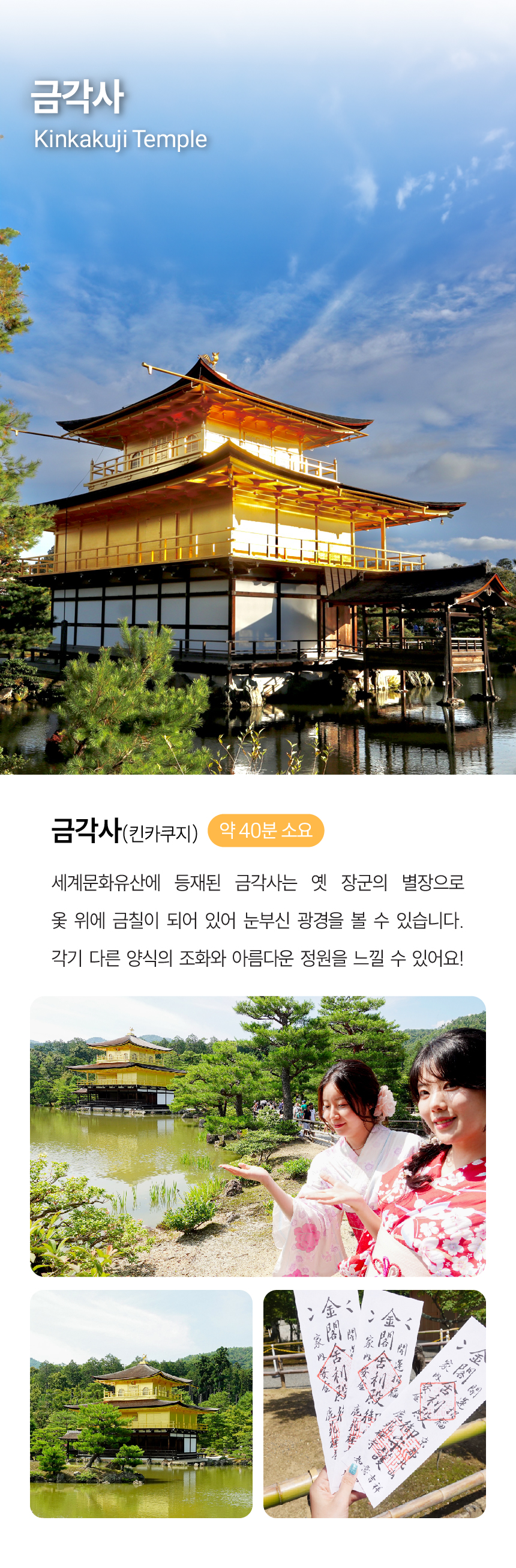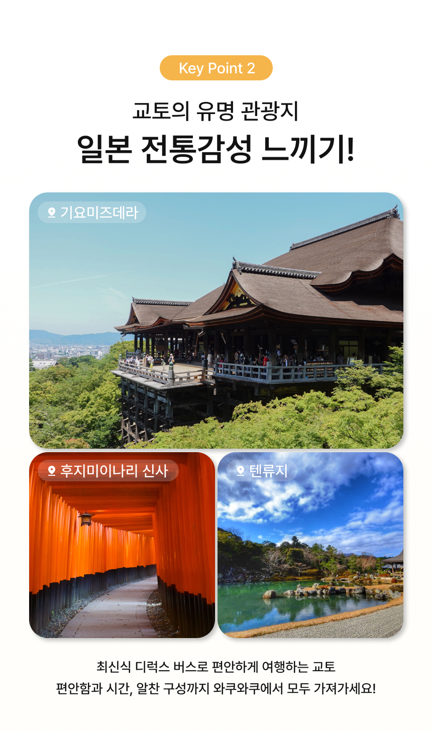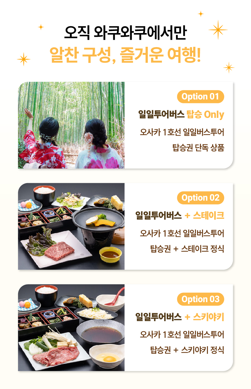 간사이 핵심 관광지를 하루에! 후시미이나리, 아라시야마, 금각사, 청수사를 대형버스로 편안하게 이동하고, 시간에 쫓기는 여행이 아닌, 넉넉한 체류 시간으로 여유롭게 즐겨보세요. 스테이크 정식과 스키야키 중 선택 가능한 식사 포함 플랜, 그리고 여행을 더욱 알차게 만들어주는 한국인 가이드 동행까지!