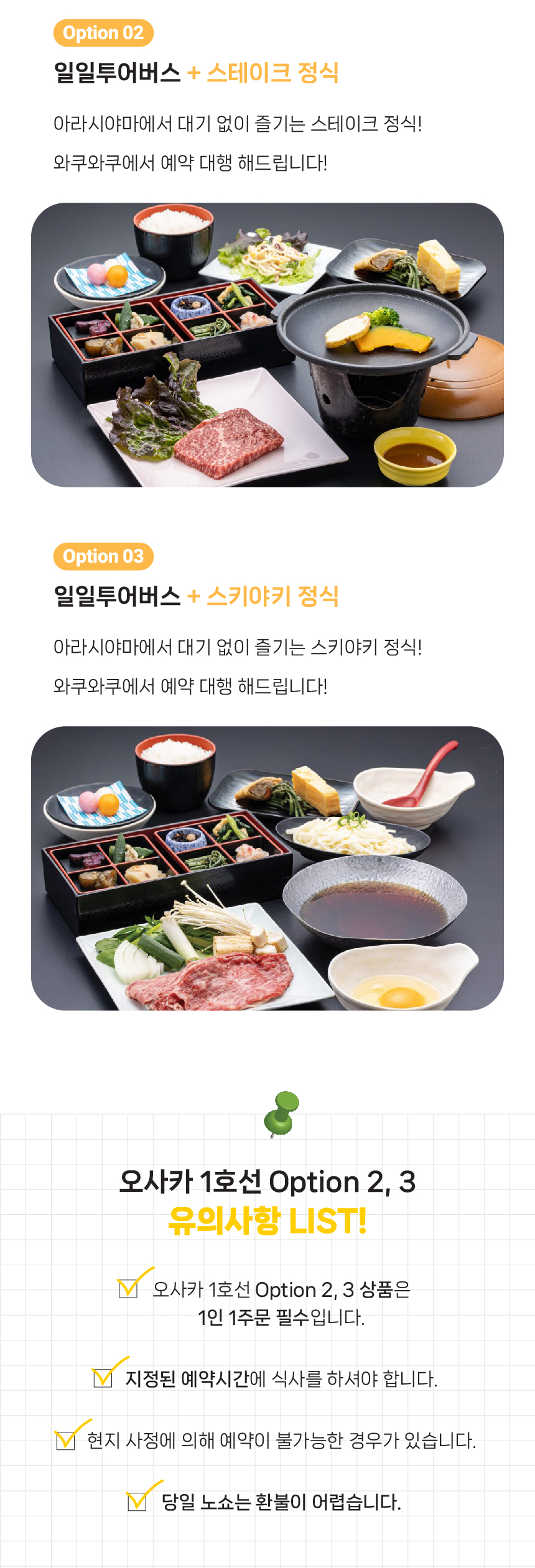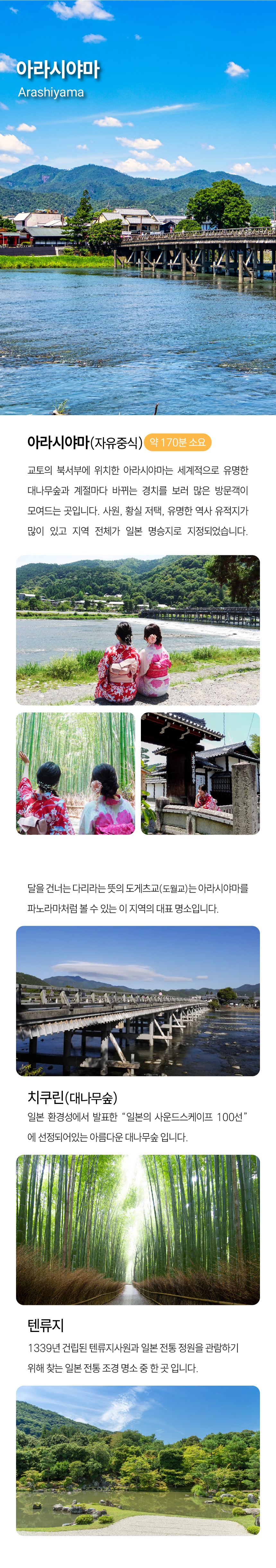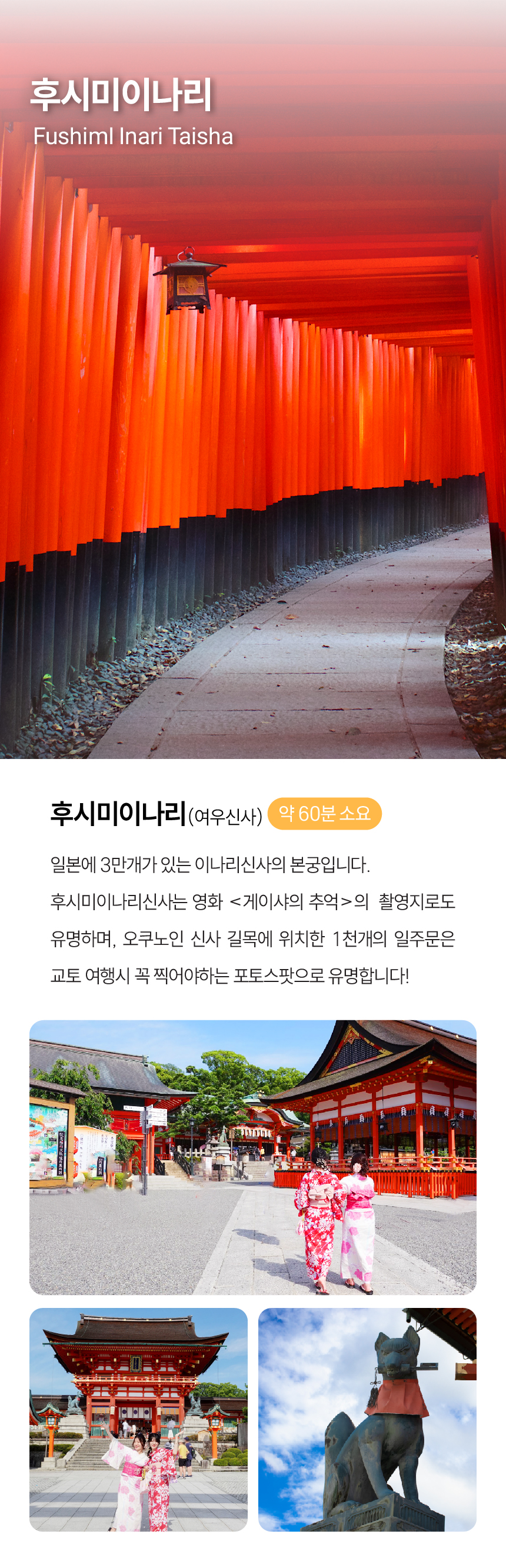 간사이 핵심 관광지를 하루에! 후시미이나리, 아라시야마, 금각사, 청수사를 대형버스로 편안하게 이동하고, 시간에 쫓기는 여행이 아닌, 넉넉한 체류 시간으로 여유롭게 즐겨보세요. 스테이크 정식과 스키야키 중 선택 가능한 식사 포함 플랜, 그리고 여행을 더욱 알차게 만들어주는 한국인 가이드 동행까지!