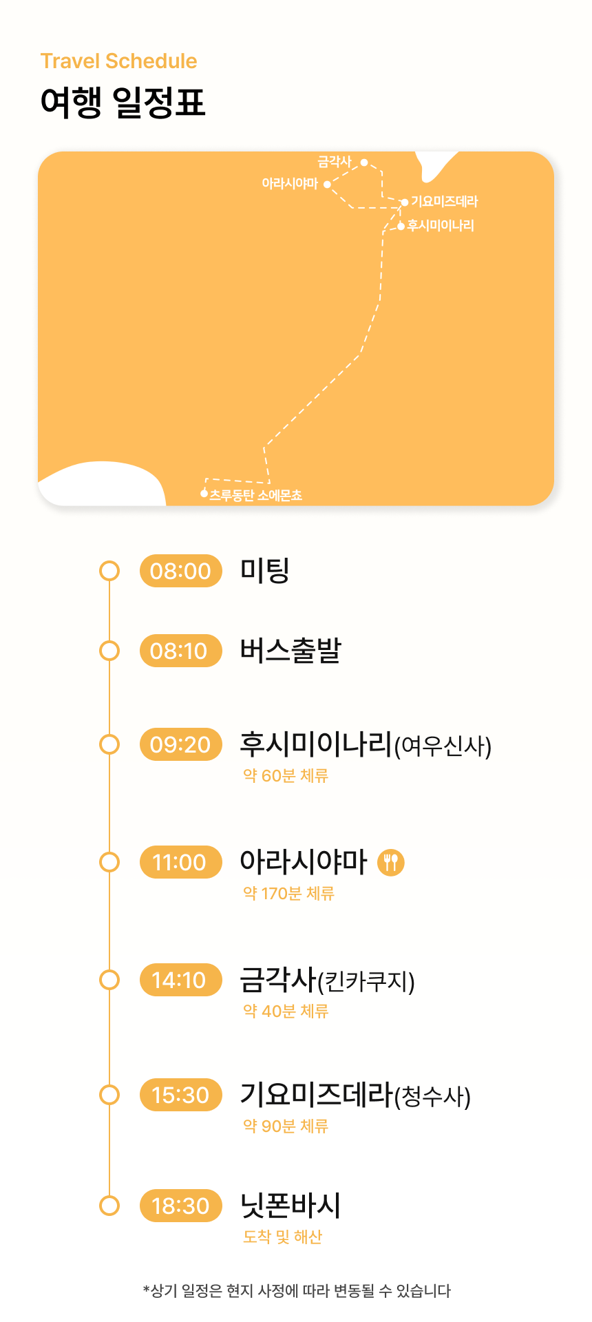베스트버스가 완전 신형으로 쾌적하고 편안했어요. 승차감 짱! 노란색 버스는 우리 것 밖에 없어서 버스 찾아 헤맬 일 없어요. 게다가 와쿠와쿠 한글 표시까지 ㅎㅎ 좌석마다 USB 충전 포트가 있어 편안하게 충전했어요. 무엇보다 동선과 희짱 가이드님의 열정적인 안내가 최고였어요. 방문지 설명과 지도, 각종 팁 공유, 오사카, 쿄토 맛집 정보까지~ 끝나고 복귀하면서 저녁 예약 도움까지 해 주시더라구요. 부모님과 초등학생 조카와 함께 와서 대중교통으로는 너무 힘들겠다 싶어서 신청했는데, 가격도 너무 좋고 최고의 선택이었어요! 아! 아라시야마에서 점심은 가이드님이 예약해 준 덕분에 두부전골 정식 편하고 맛있게 잘 먹었어요. 와쿠와쿠 아주 좋았어요~~