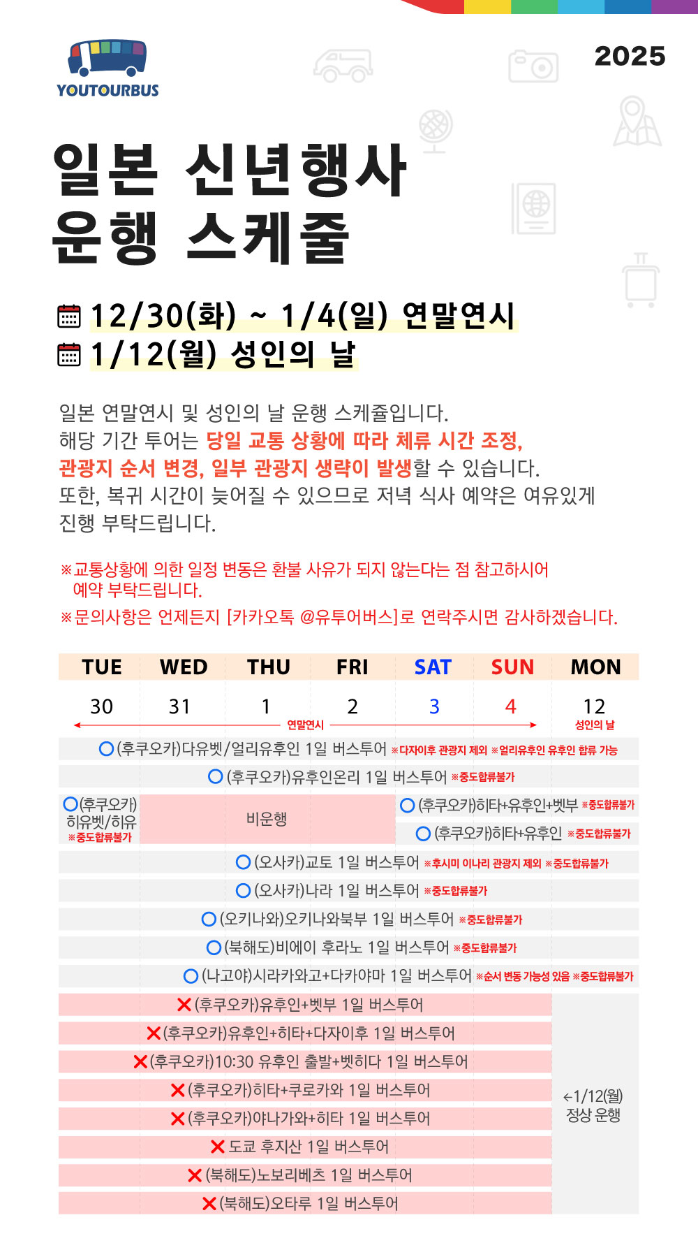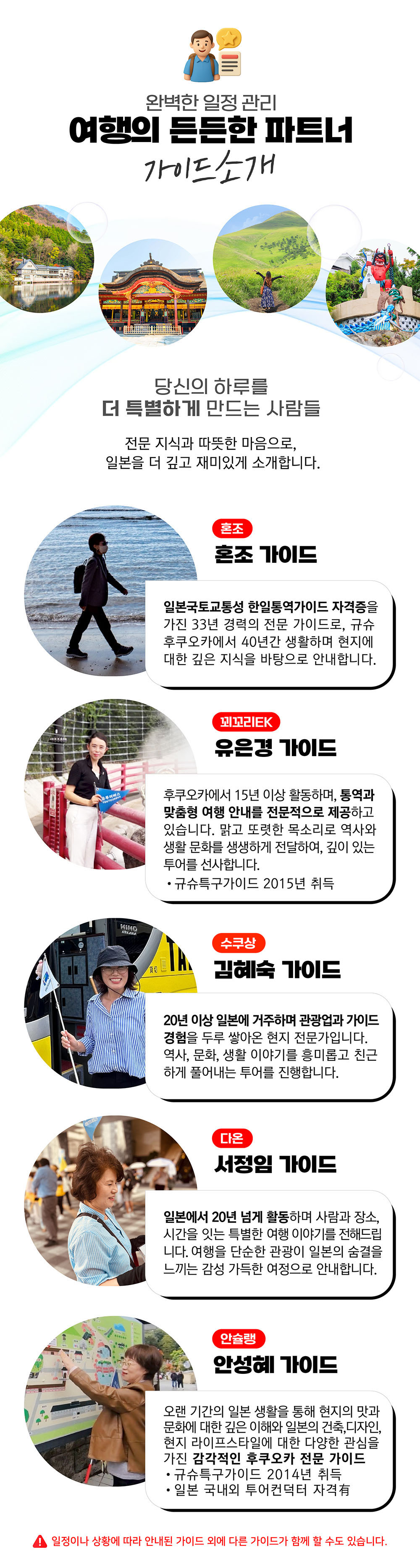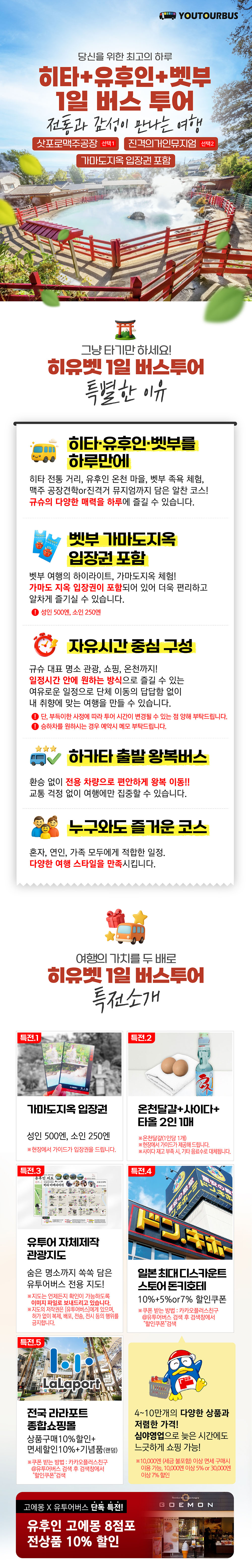 이 투어는 많은 분이 방문하는 후쿠오카에서 출발하는 버스 투어로, 편안하게 이동 및 관광이 가능해요. 방문하는 관광지 중 가마도 지옥 입장권을 무료로 제공하고 있고, 유후인 숙소를 이용하시는 분들은 유후인에서 하차하실 수도 있어요. 자 이제 편하고 알찬 버스 투어를 즐기러 떠나보실까요?