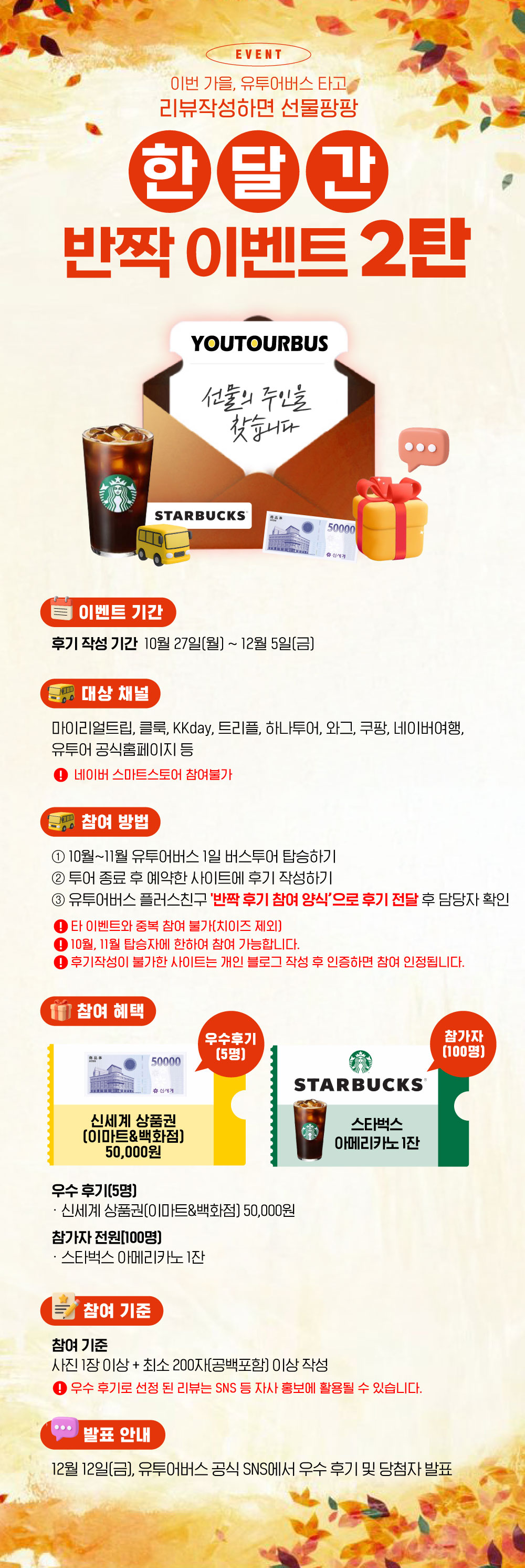 한국어 제공❤️유투어버스 단독 특전이벤트! 유투어버스를 이용하는 고객님 한정 유후인 인기 과자공방 고에몽 전상품 10%할인 특전을 드립니다! * 연말연시 일부 날짜에는 운행되지 않습니다. (12/31~1/2) 성인의 날은 정상적으로 운행됩니다.
