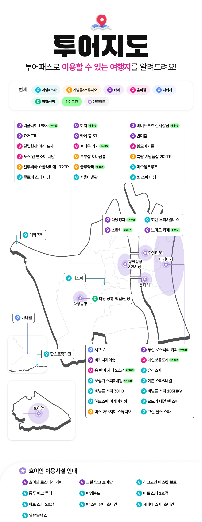 제휴 업체를 찾기 어려울까봐 걱정이신가요? 다낭패스 제휴 가맹점 표시를 보고 쉽게 알 수 있고, 위치 기반 서비스로 현재 위치 중심으로 가까운 여행지와의 거리를 알 수 있답니다. 투어 패스는 여러분의 여행 일정에