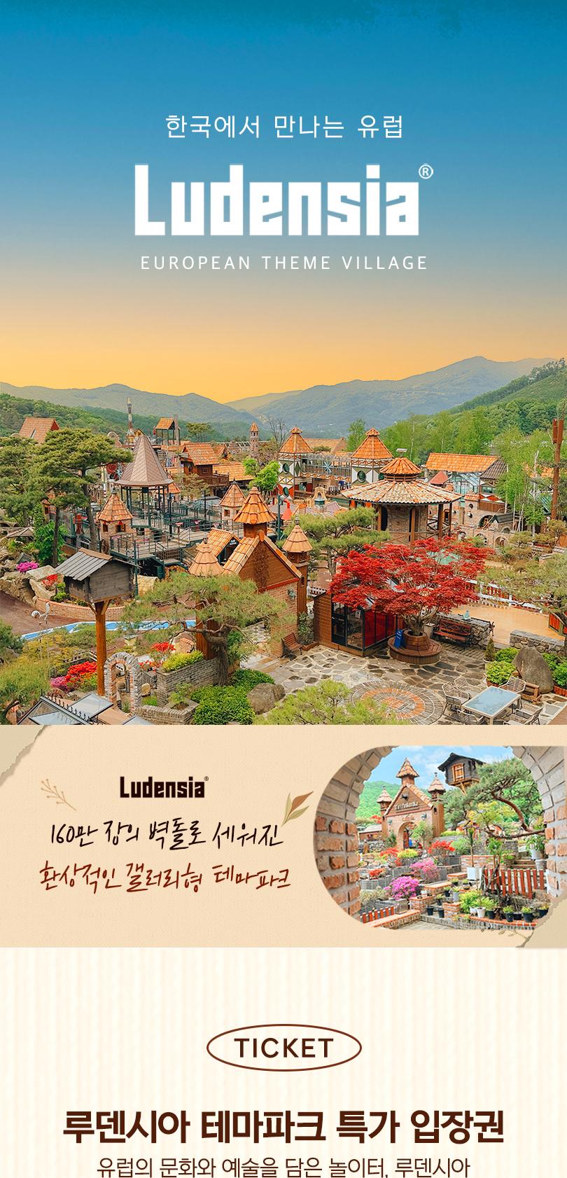 유럽에 온 듯한 황홀한 풍경을 자랑하는 루덴시아는 160만 개의 고벽돌로 쌓아 올린 건축물과 빈티지 앤틱 소품들로 가득 채워져 이국적인 분위기를 자랑해요. 특히, 어둠이 내리면 반짝반짝 은하수 별빛 아래 화려한 옷으로 갈아입는 루덴시아에서 환상적인 야경을 즐겨보세요.