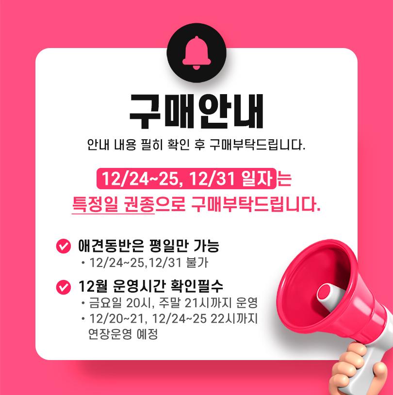※ 12/20 ~ 21 / 12/24 ~ 25 오후 22시까지 연장운영 예정입니다.