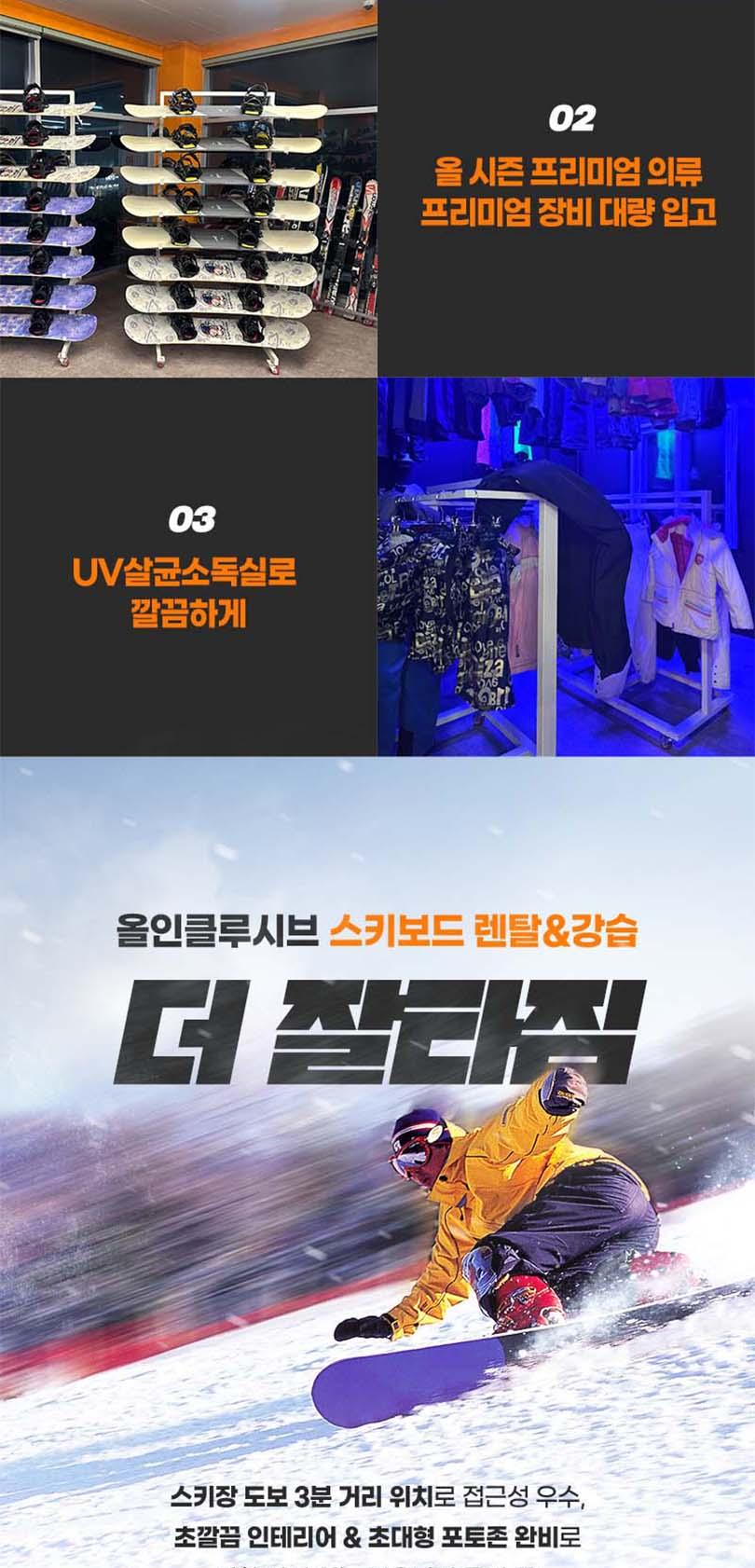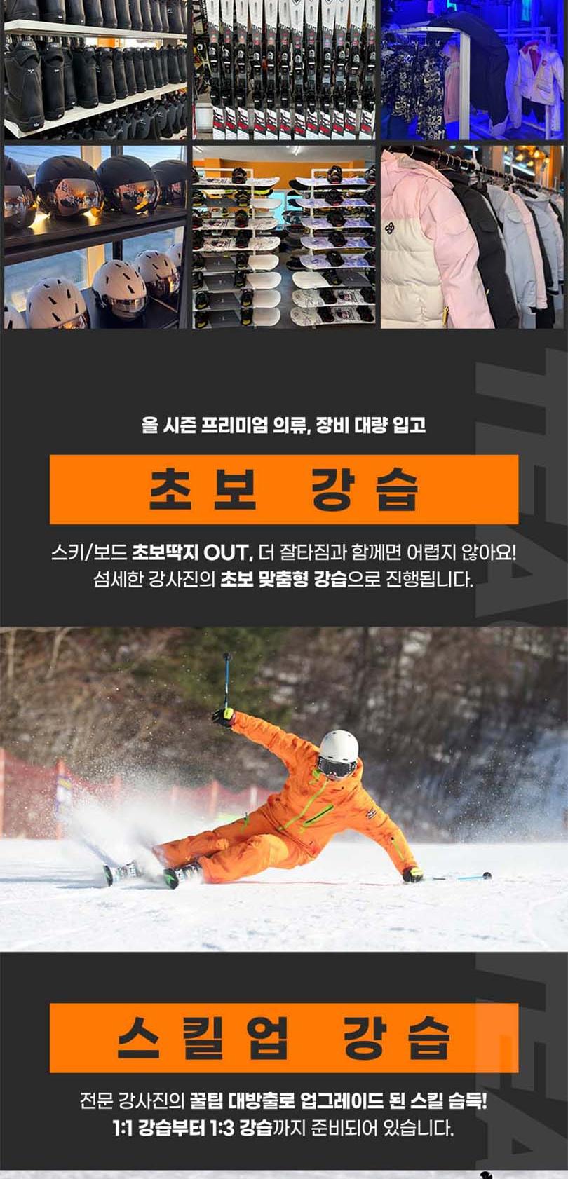신규 오픈으로 더욱 깔끔해진 인테리어와 넓은 공간에서 신상 의류와 다양한 스키·보드 장비를 한 번에 렌탈할 수 있으며, 1일 1회 세심한 장비 점검 및 튜닝으로 누구나 만족할 만큼의 퀄리티를 제공합니다. 오크밸리까지 도보 3분 거리의 뛰어난 접근성 덕분에 이동도 편하고, 초대형 인생 포토존에서 겨울 감성 가득한 인증샷까지 남길 수 있어요. 여기에 체계적으로 운영되는 직영 강습센터가 있어 처음 타는 분들도 전문가에게 기초부터 제대로 배울 수 있는 장점까지!