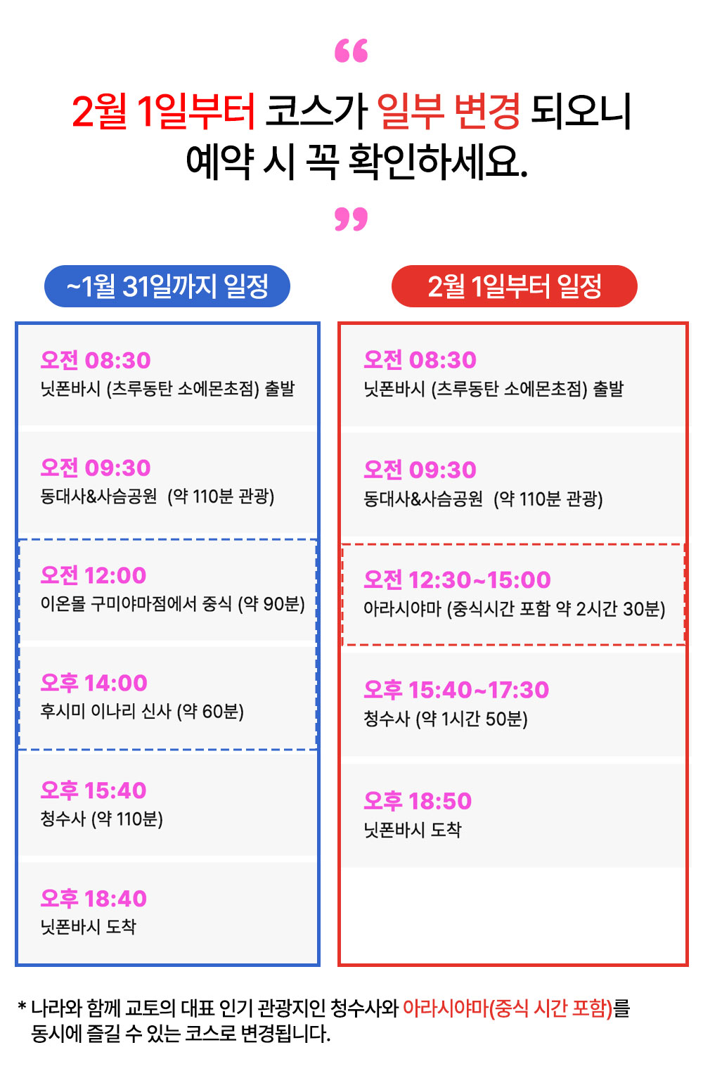 하지만 지하철로 다니기 쉬운 오사카와 달리 열차와 일반 버스를 타고 다녀야 하는 불편함이 있는 교토와 나라. 어떻게 여행해야 할지 고민하셨다면 교토 & 나라 일일 버스 투어를 추천해요! 오사카에서 출발해 교토와 나라의 관광지 중 가장 가볼 만한 곳 4곳을 추스려서 아름다운 추억을 가득 만들어드립니다. 자 이제 와그와 함께 볼거리가 가득한 교토 & 나라로 떠나보실까요?