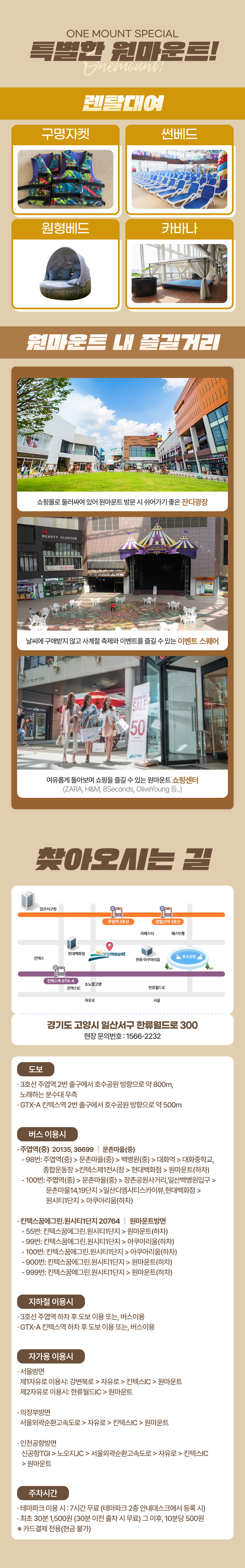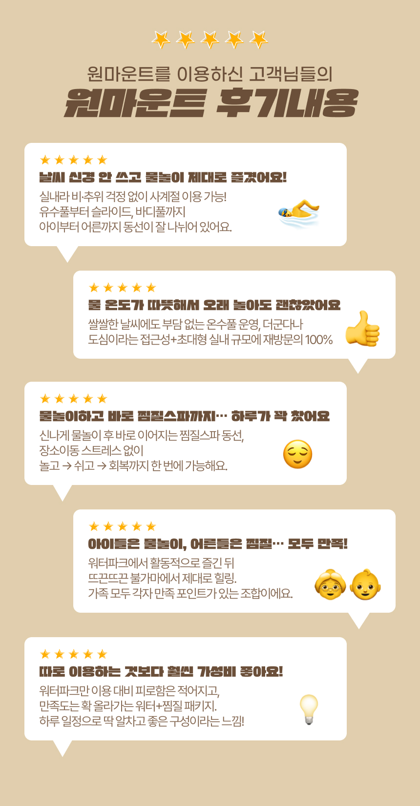 한국어 제공모험심을 자극하는 짜릿한 슬라이드! 파도풀, 유수풀 등 도심에서 즐기는 최고의 어트랙션이 준비된 원마운트 워터파크를 방문하세요. 실내존에는 300m 길이의 해저탐험 유수풀과 원심력을 견디는 스릴만점 킹볼라이드가 준비되어 있어요. 초고속 스피드를 느낄 수 있는 스피드뱅도 즐겨보세요!