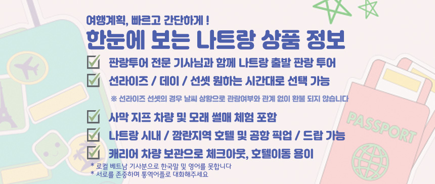 나트랑 사막투어라고 하면, 많은 분들이 무이네 지역 투어를 생각하시죠. 무이네는 아름다운 사막과 선셋이 공존하는 지역이지만, 나트랑에서 긴 이동시간을 감수해야 한다는 단점이 있어요.