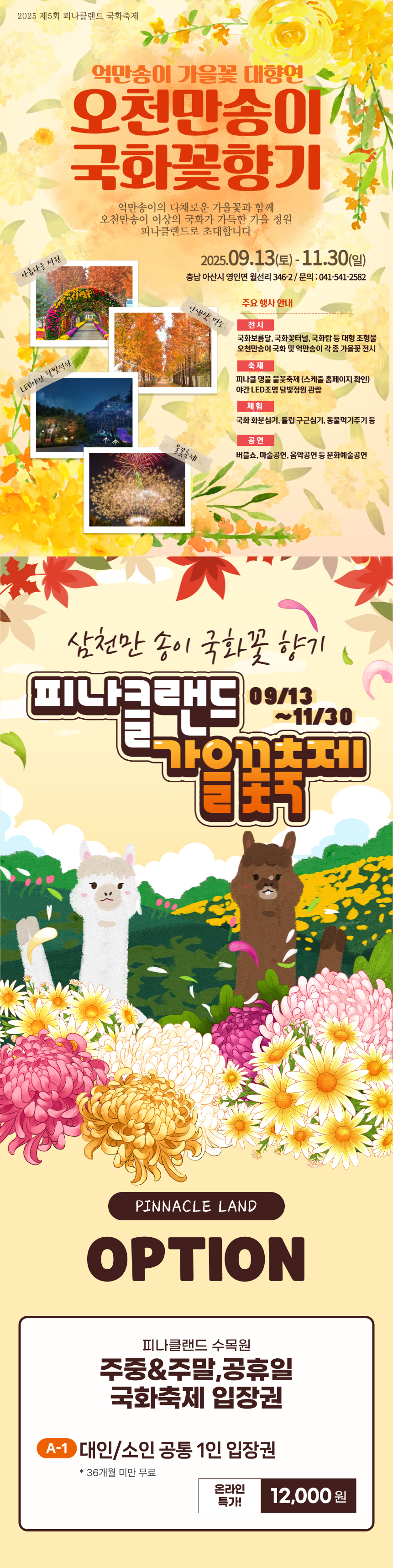 사계절 언제나 아름다운 원형 정원부터 천천히 거닐며 만끽하는 미니 정원길까지 만나보세요. 피나클랜드에는 알파카와 유산양, 관상닭 등 다양한 동물 친구들도 함께 만나볼 수 있어요. 동물 친구들에게 먹이를 나눠주며 교감도 느껴보세요. 9월 13일부터는 가을 꽃 축제도 하고 있어요! 삼천만송이 국화와 조형물이 전시 되어 있답니다. 피나클랜드에서 5월부터 직접 정성스럽게 식재한 삼천만송이 국화와 국화터널, 국화탑 등 80여종의 국화로 만든 국화 조형물들이에요. 그리고 9월 20일부터 매주 토요일마다 불꽃축제도 함께 진행하고 있어요. 피나클랜드에서 다양한 추억, 가득한 행복 담아가세요!