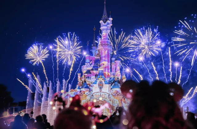 잠자는 숲속의 공주 성 위에서 펼쳐지는 불꽃놀이, 영상, 음악과 함께 숨 막힐 듯 아름다운 야간 쇼에요.