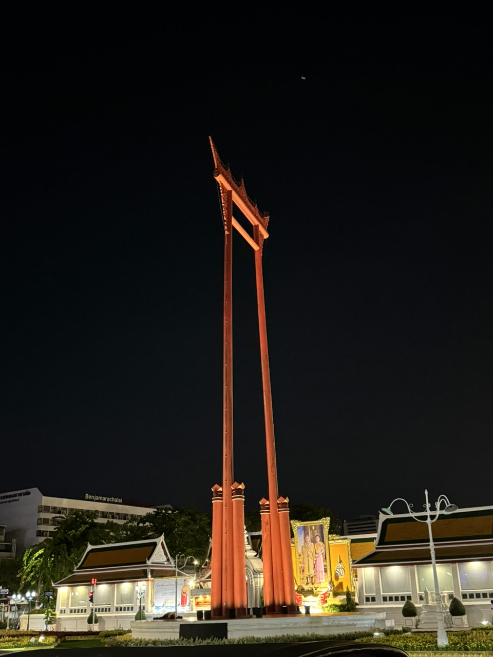 왓 쑤탓은 라마 1세 때인 1784년에 만들기 시작해 라마 3세 때 완공된 태국의 주요 6개 사원의 하나예요. 왓 쑤탓 입구 건너편에는 문(門)처럼 생긴 빨간 기둥이 있는데요, '싸오 칭차(Sao Chin Cha)'로 '대형 그네'를 뜻한다고 해요. 힌두의 창조와 파괴의 신인 시바를 맞이하기 위한 브라만 행사를 하던 곳으로 빈번한 사고로 인해 라마 7세 이후부터 사용이 금지되어 현재는 그네 틀만 남아 있어요.